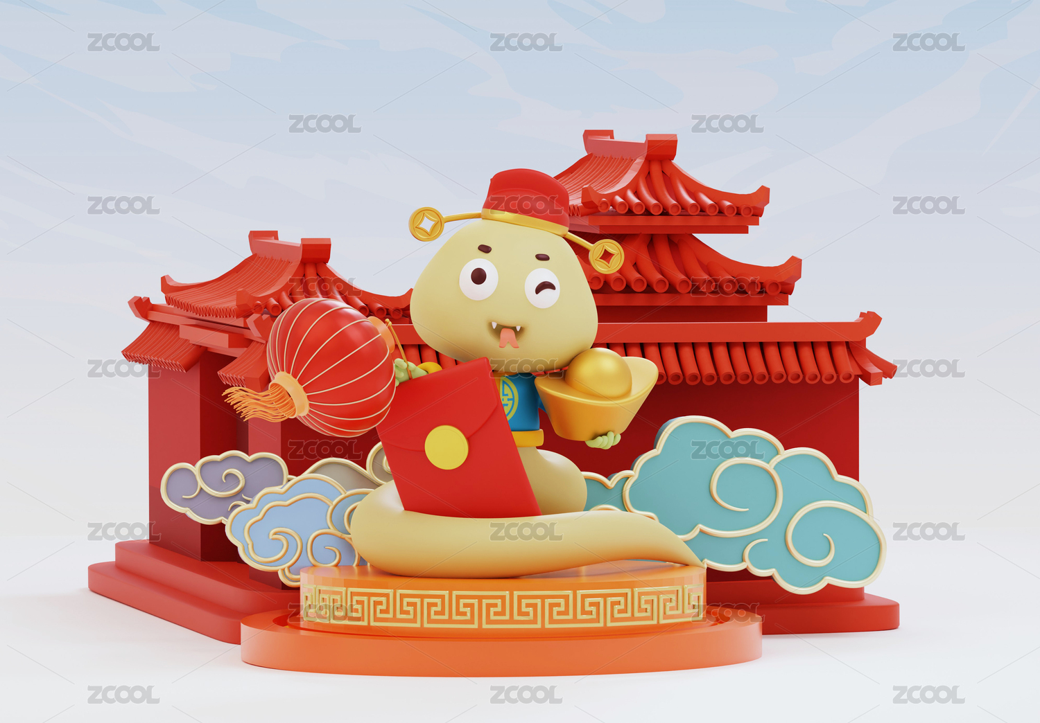 3D中國(guó)風(fēng)生肖蛇年卡通吉祥物財(cái)神到慶典