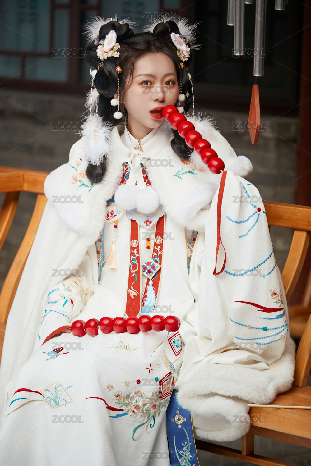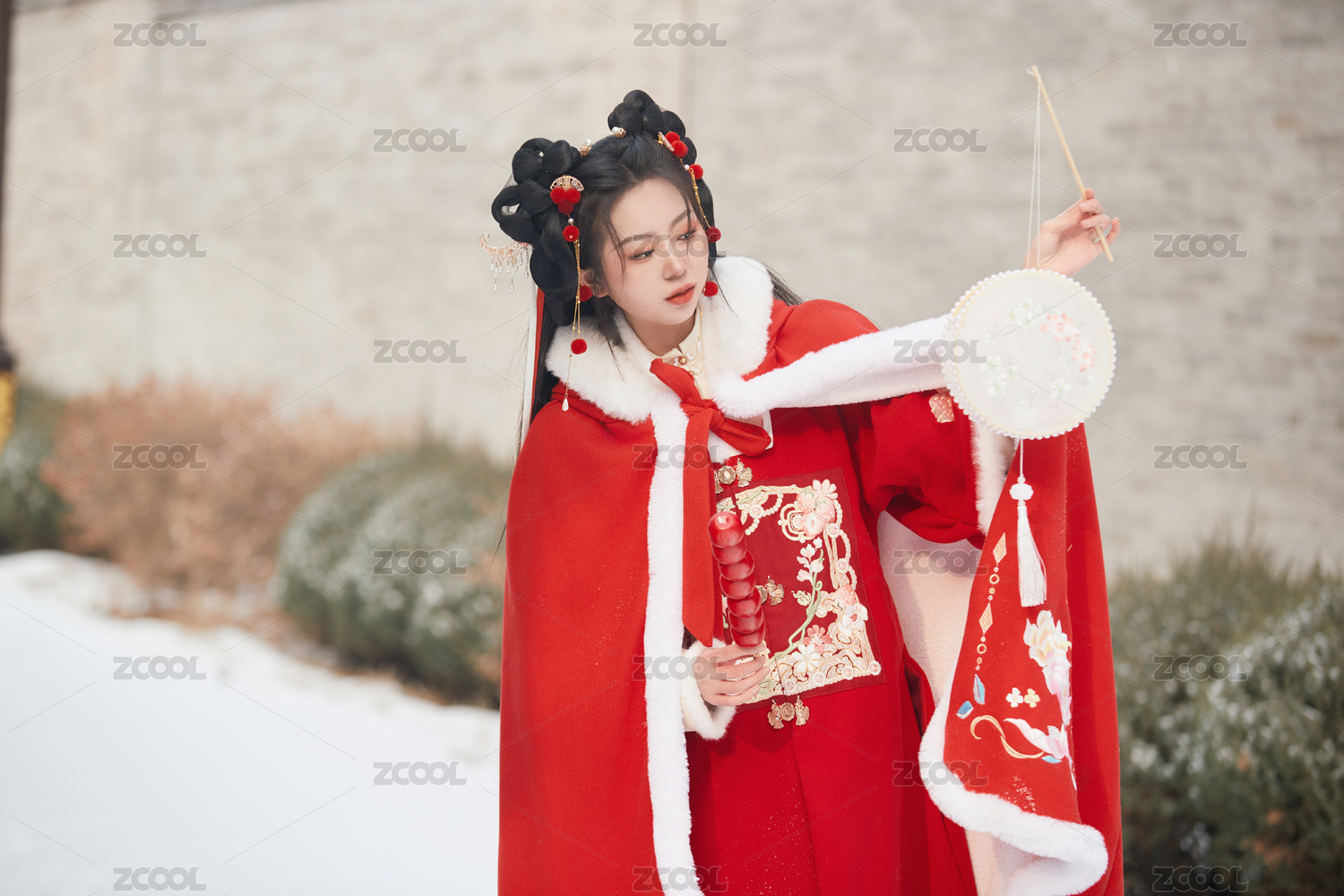 雪天戶外身穿中式紅色漢服的亞洲少女