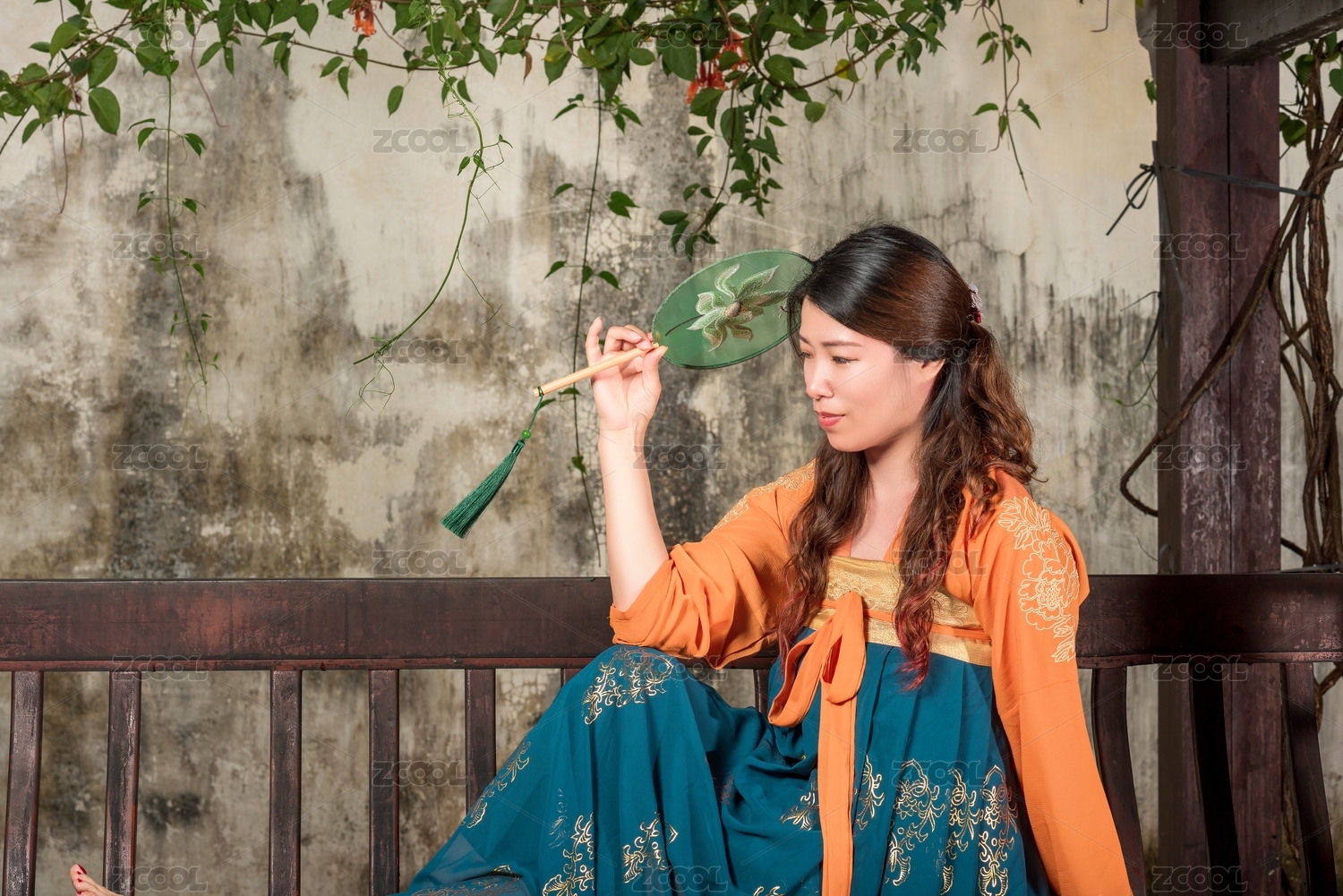 可愛亞洲美女穿著漢服手握扇子坐在連廊臺(tái)上