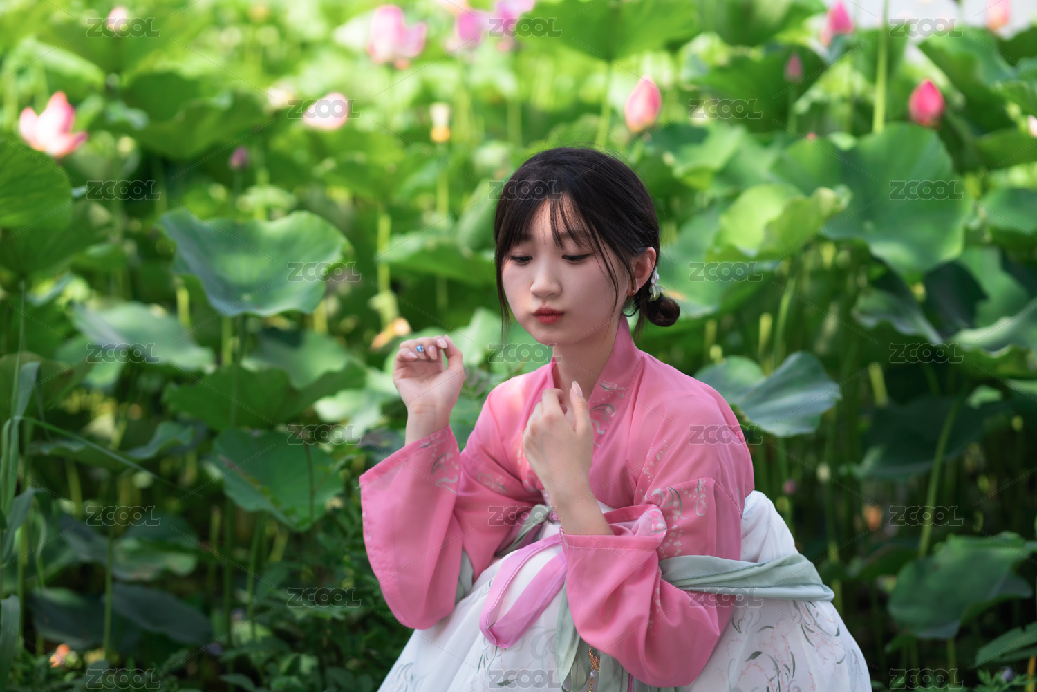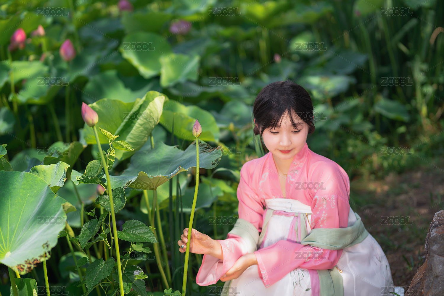 亞洲美女穿著漢服在荷花池邊蹲姿的半身像