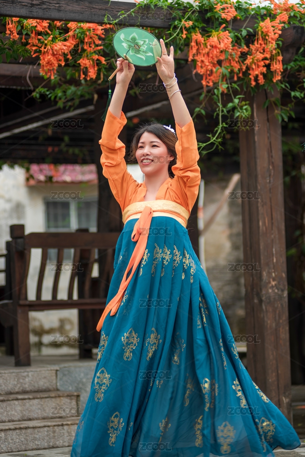 亞洲美女穿著漢服手握油紙傘在古代園林跳舞