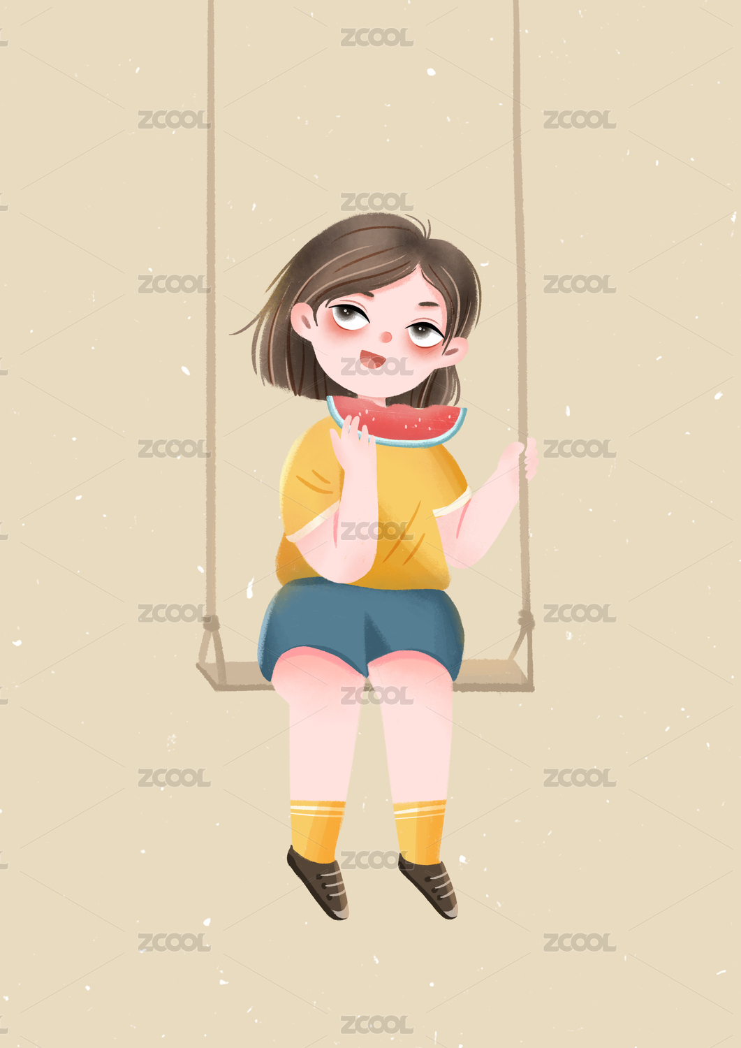 原創(chuàng)插畫 萌系小可愛 坐在秋千上吃西瓜