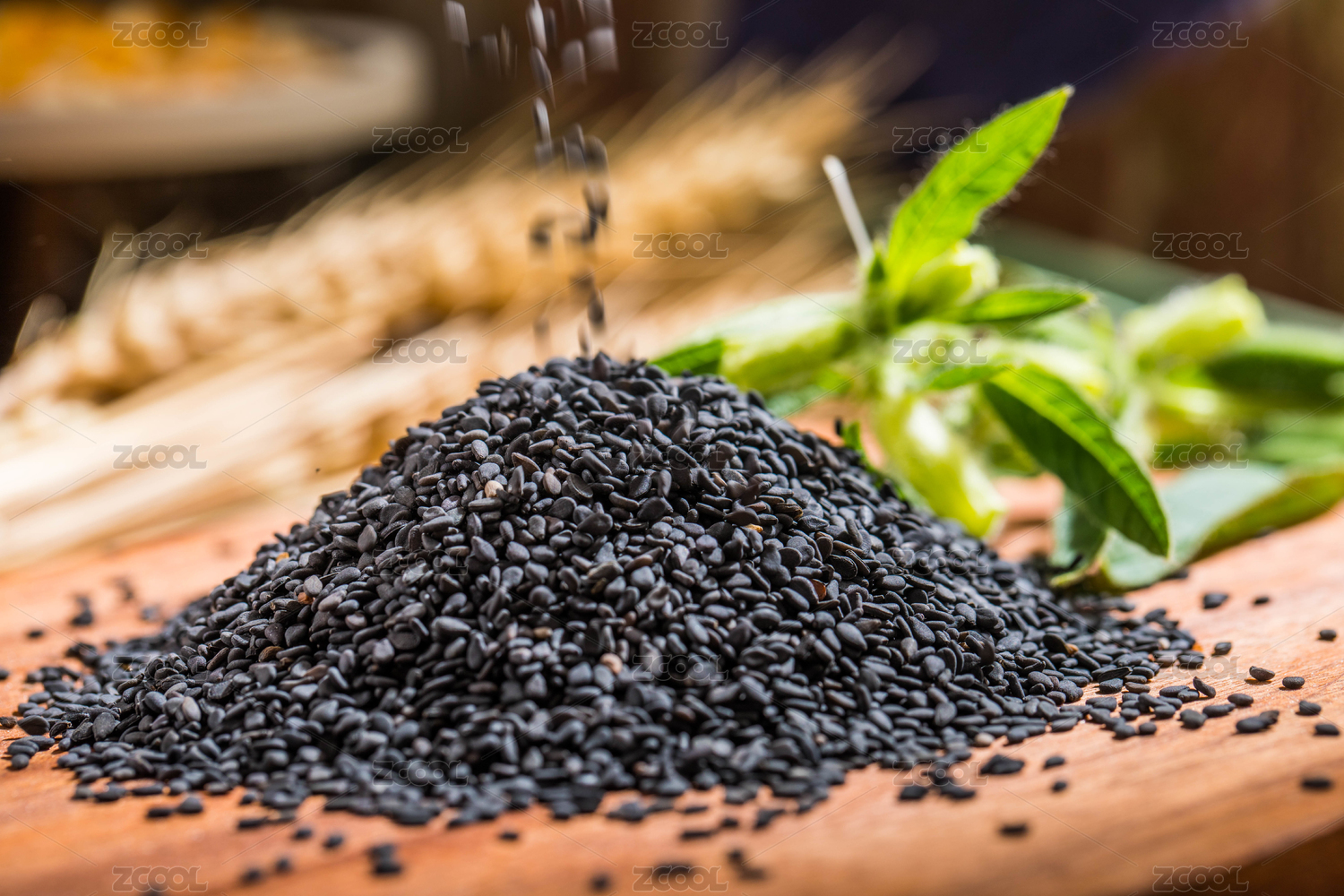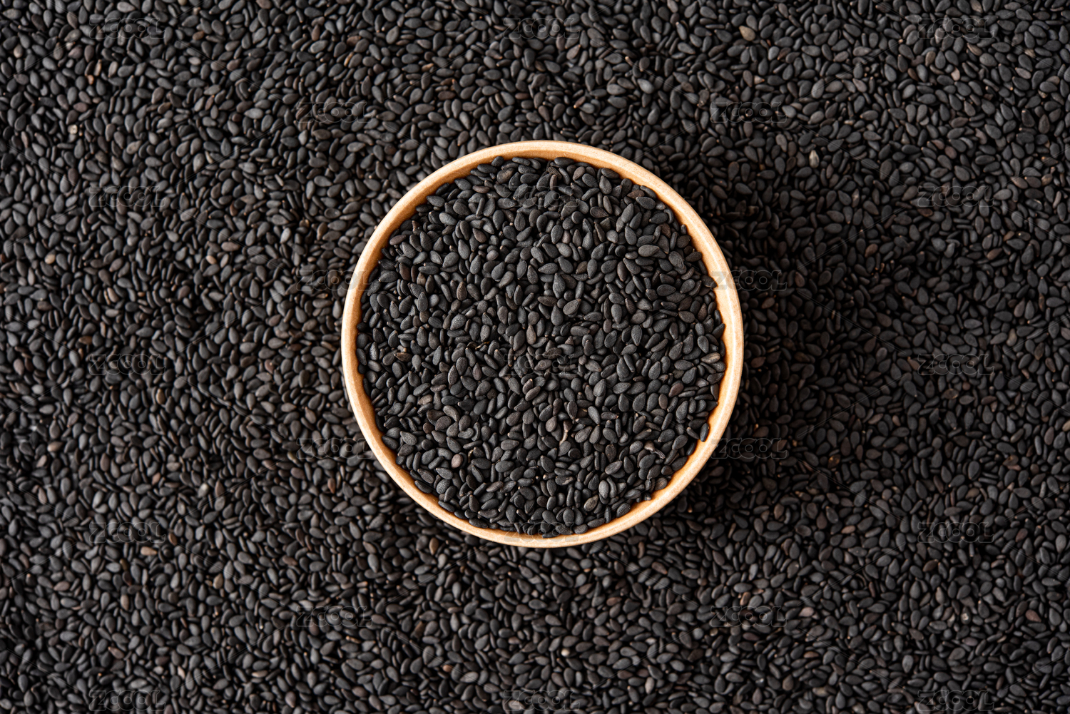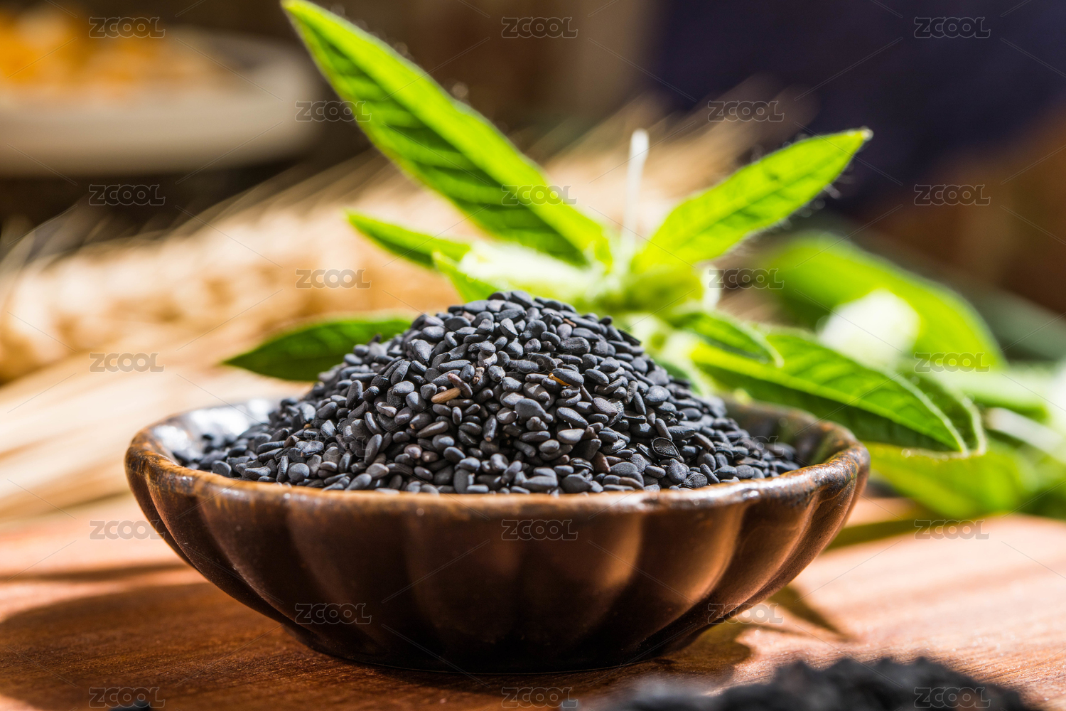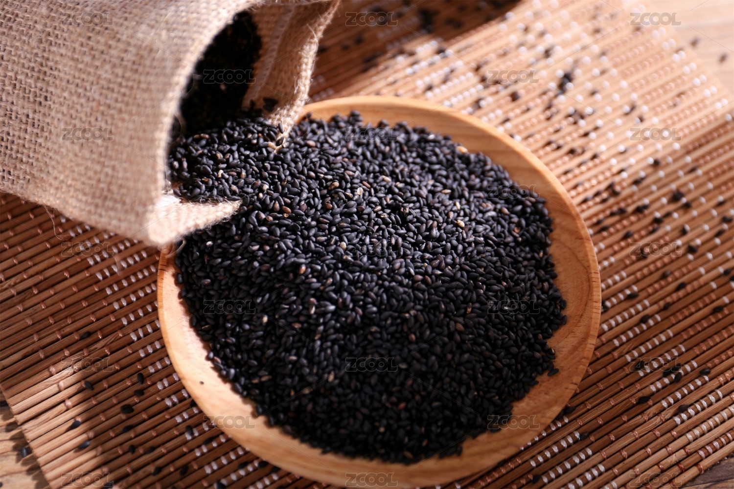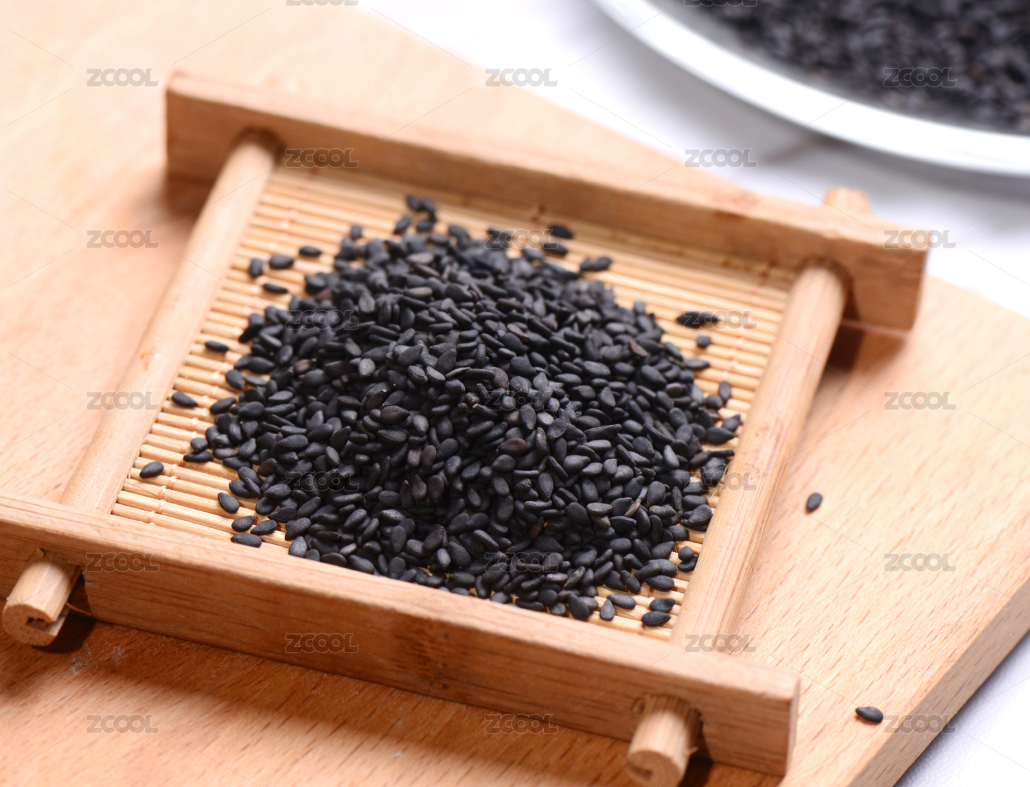 放在竹簾背景上木盤(pán)里的黑芝麻