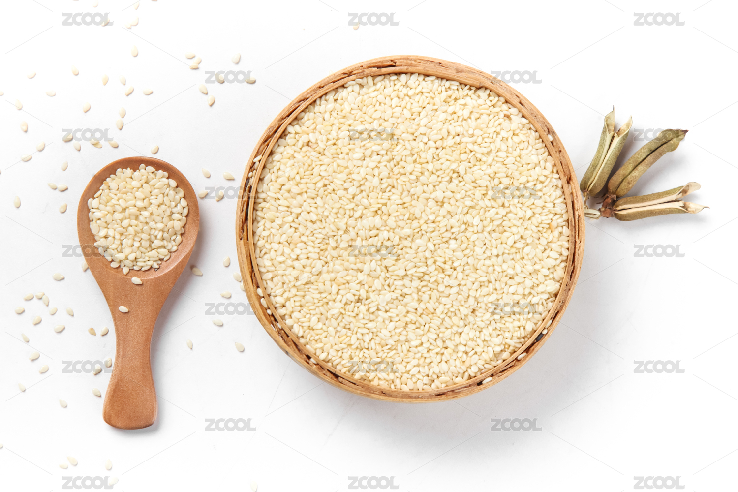 白底上篩子和勺子里裝著的東北白芝麻