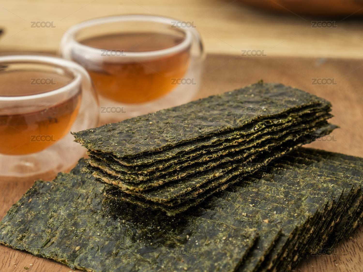 木頭盤(pán)子里的排列整齊的芝麻海苔零食