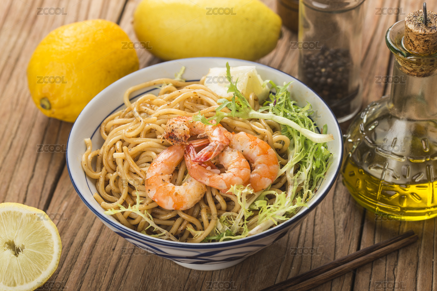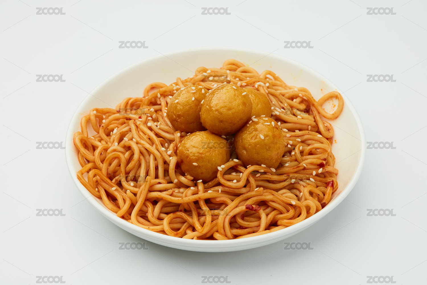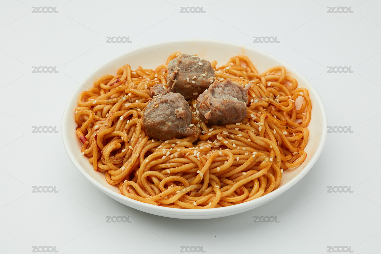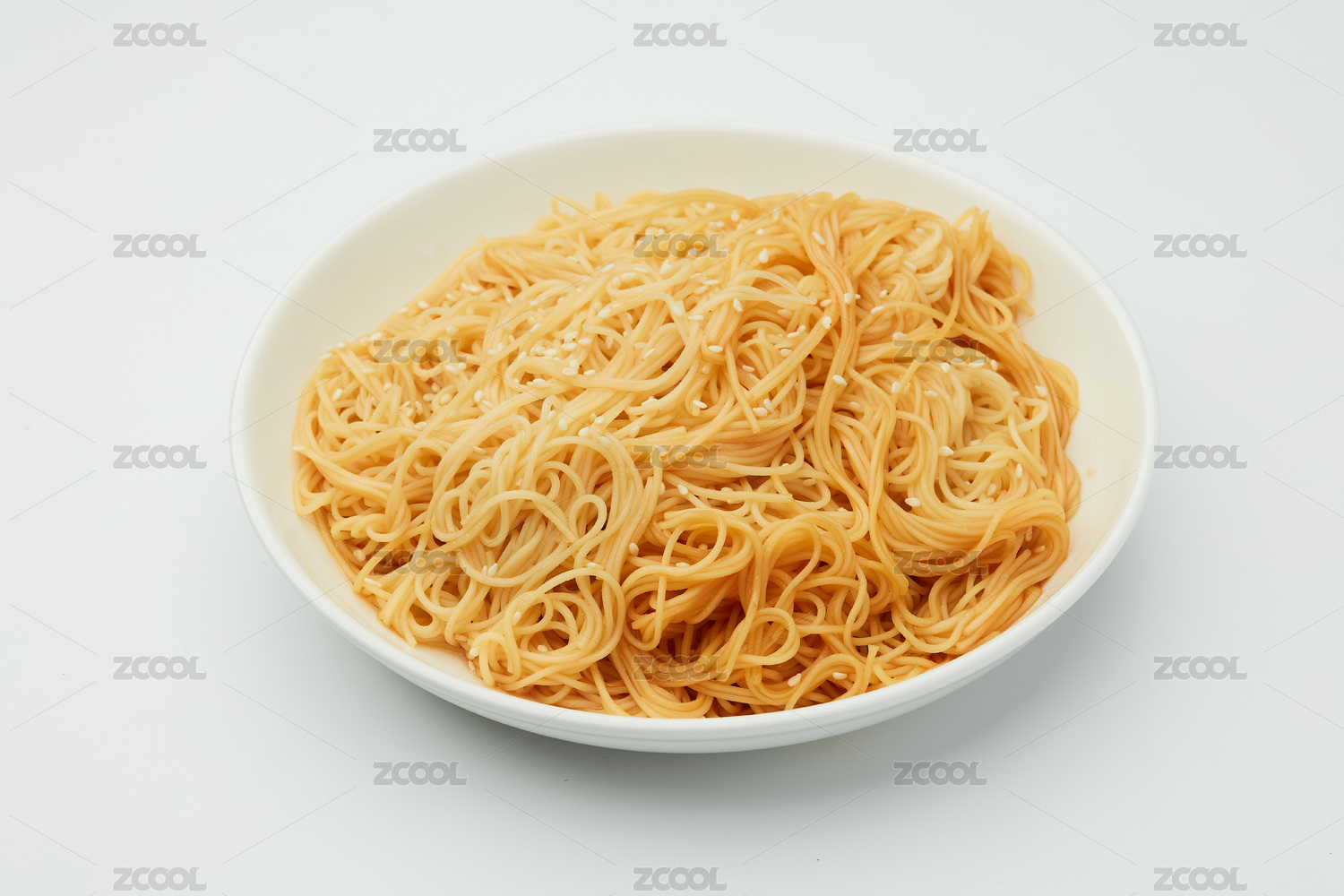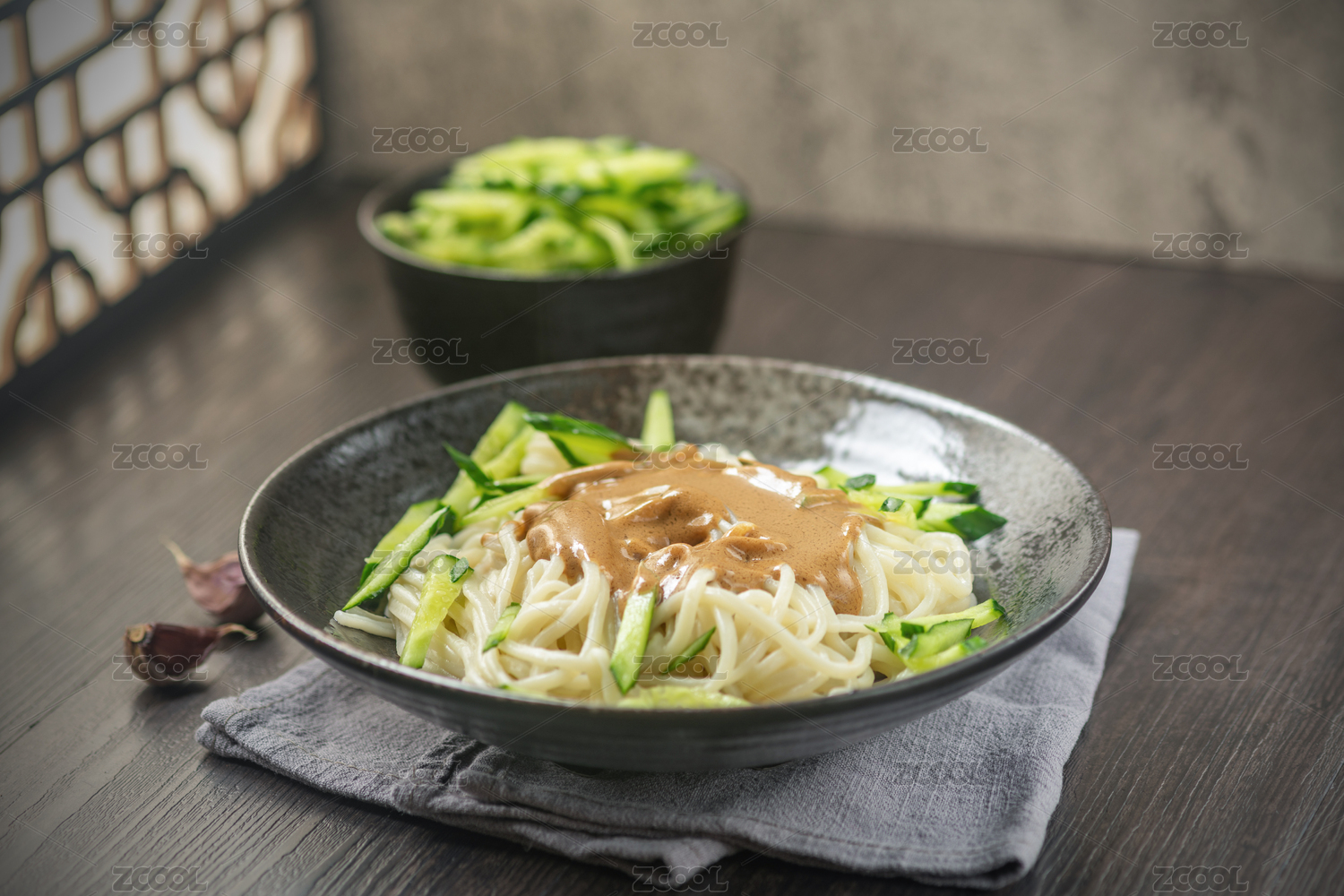 一碗麻醬面擺放在桌面上旁邊放有黃瓜絲蒜瓣