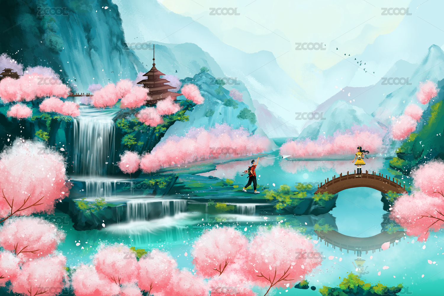 少年在開(kāi)滿(mǎn)桃花的山林旅游插畫(huà)