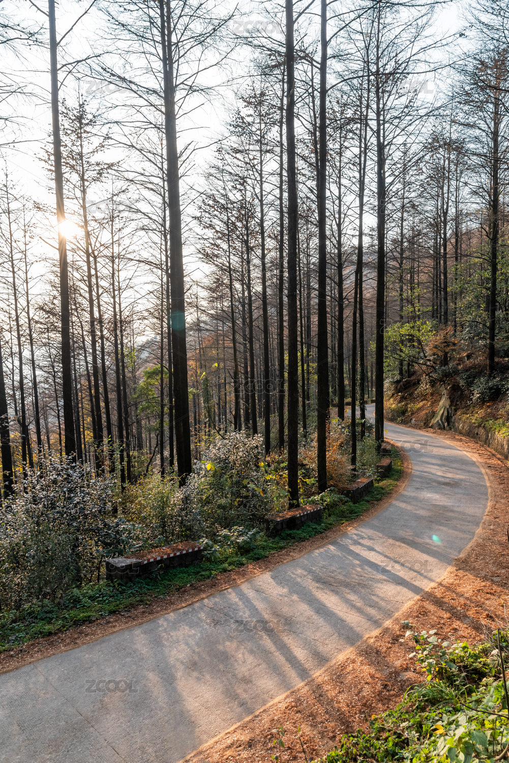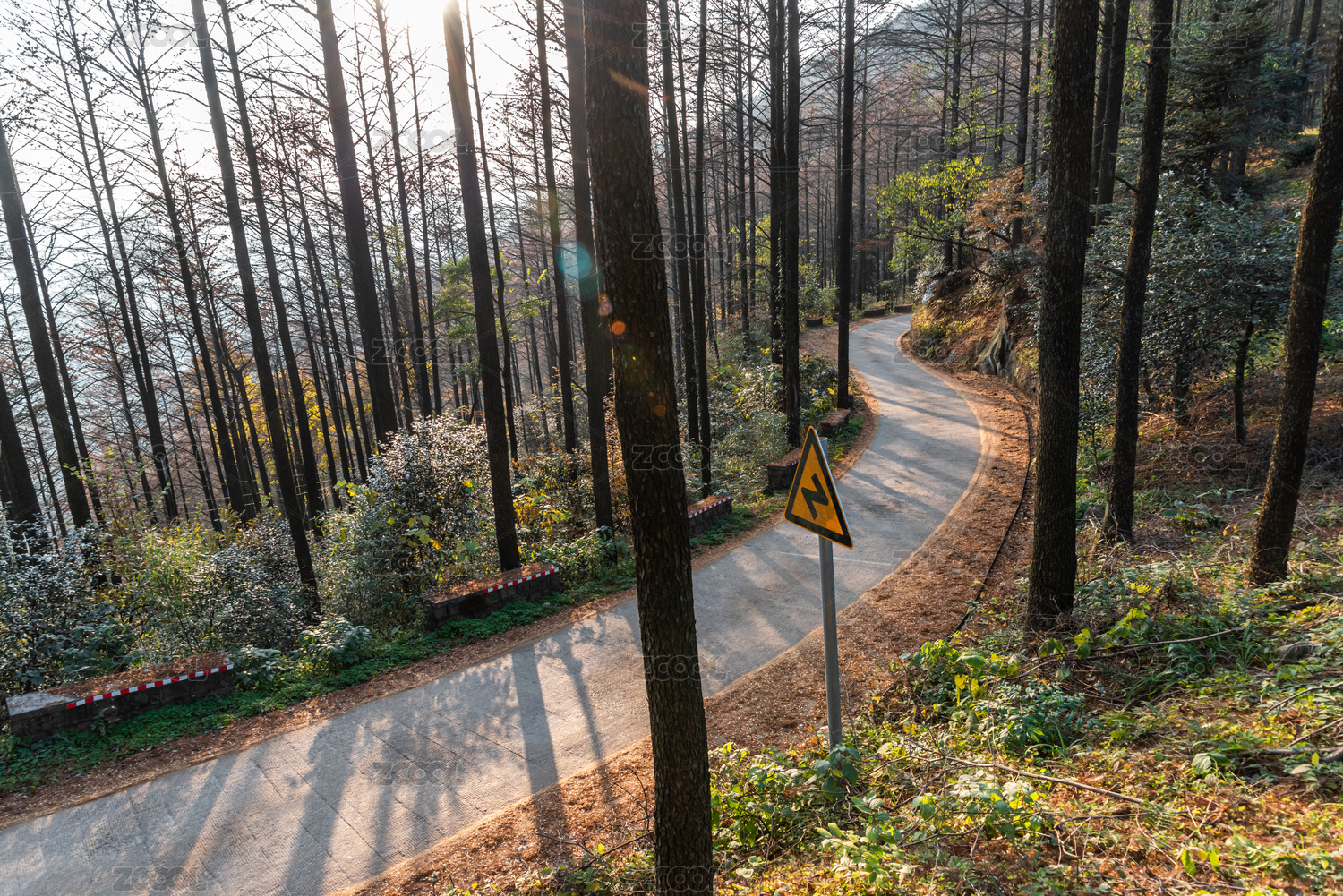 秋季的中國(guó)浙江莫干山林中彎曲的道路