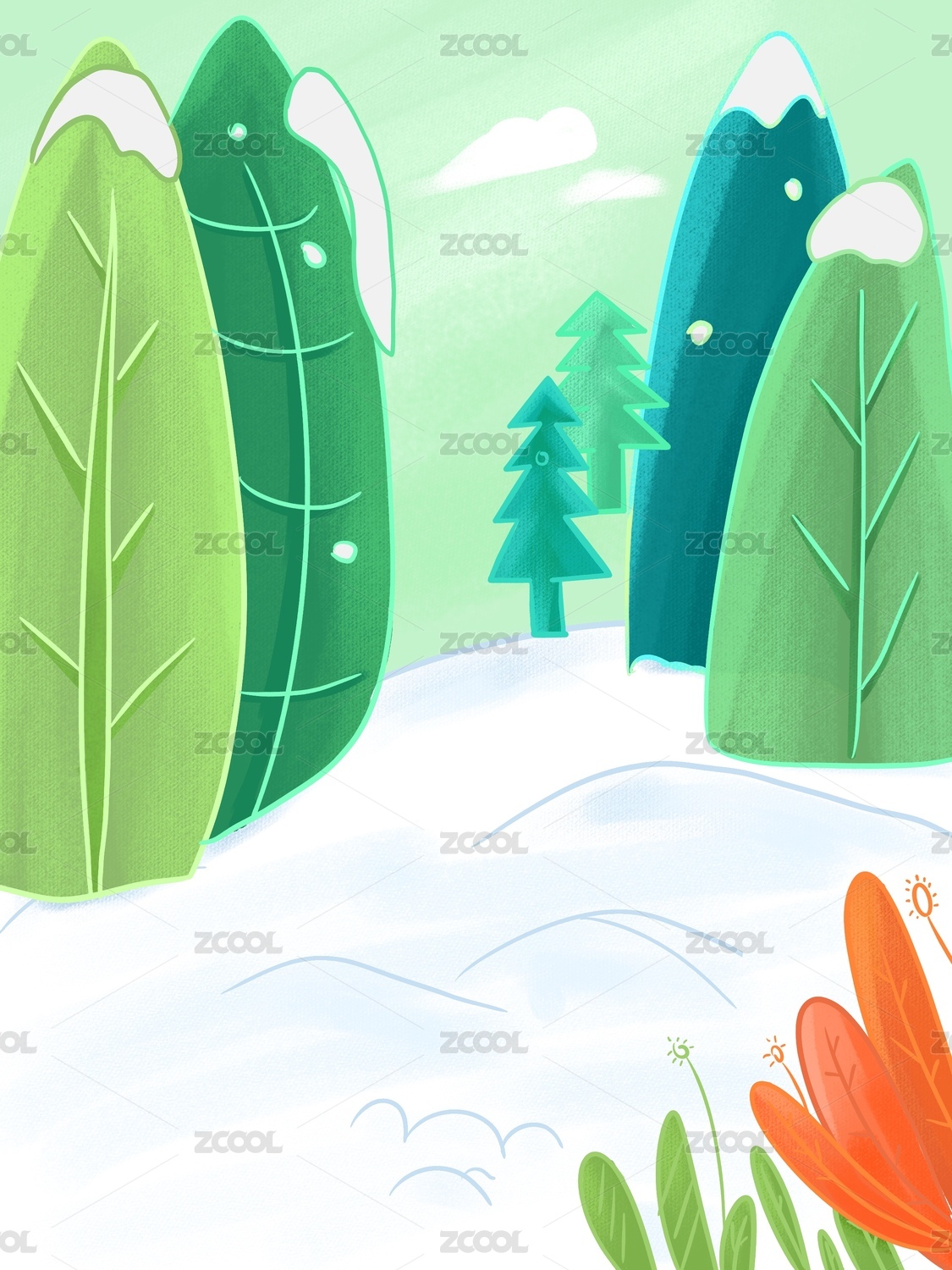 卡通冬季清新治愈扁平化山林風(fēng)景插畫(huà)