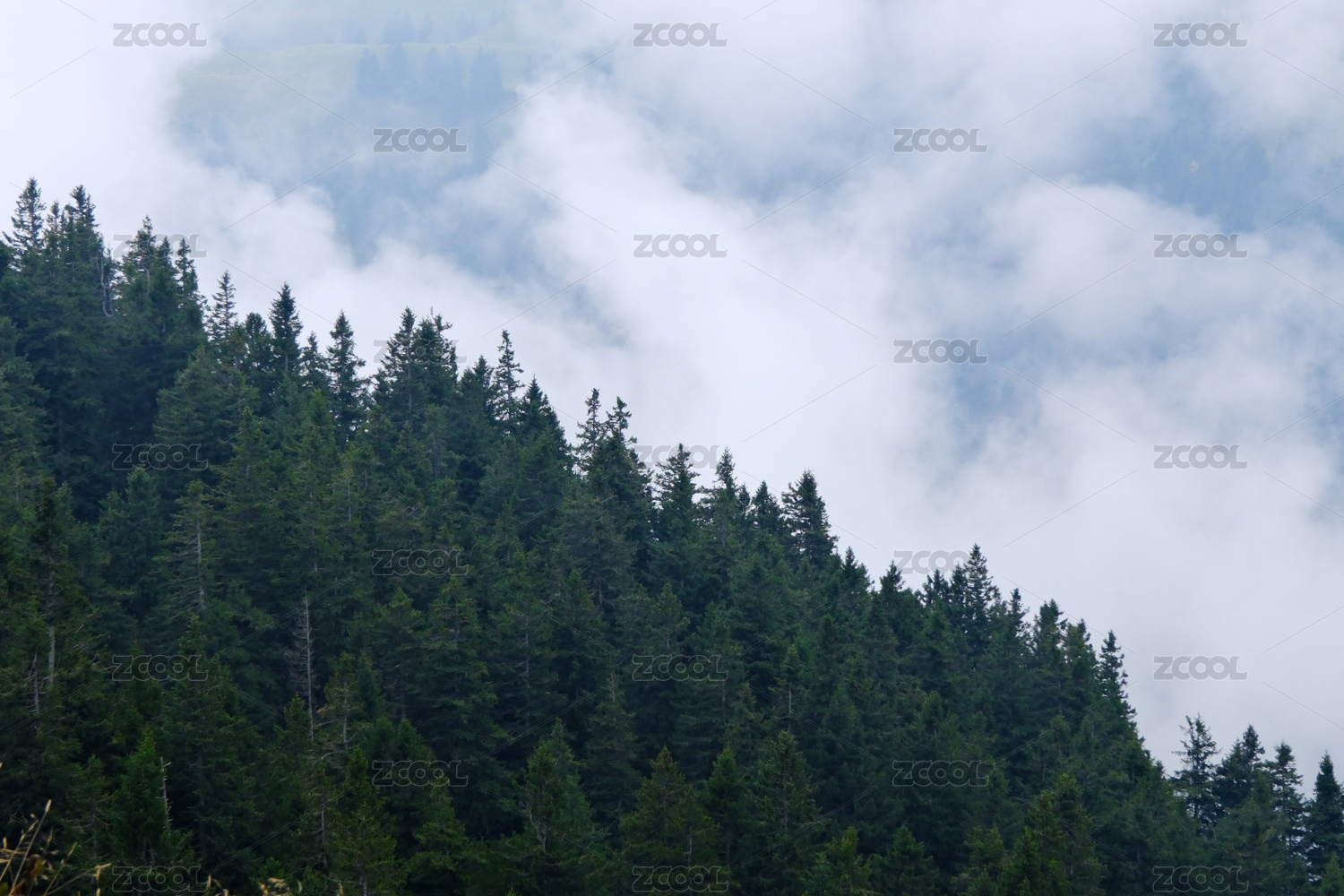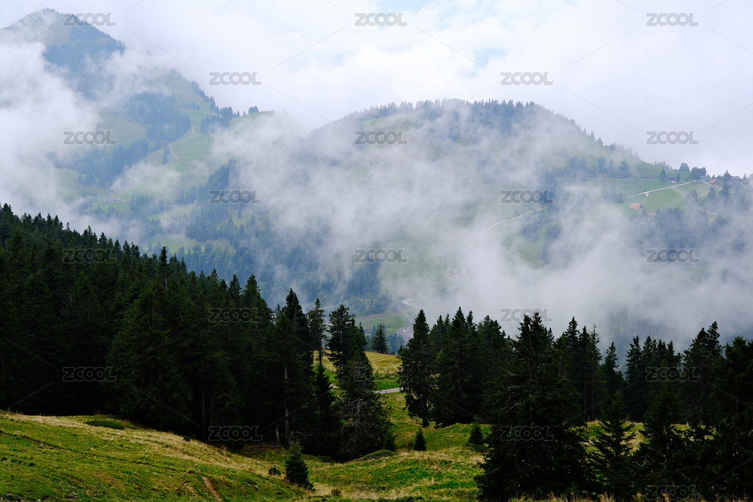 瑞士瑞吉山的云霧繚繞的山林景觀