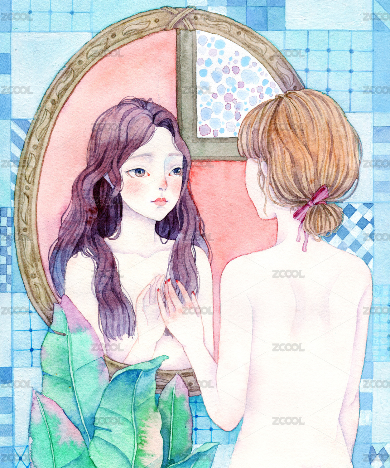 鏡子中的另一個(gè)她,水彩插畫(huà)