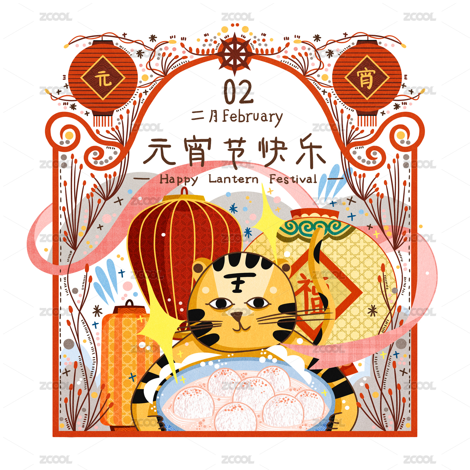 二月元宵老虎新年元素原創(chuàng)插畫(huà)