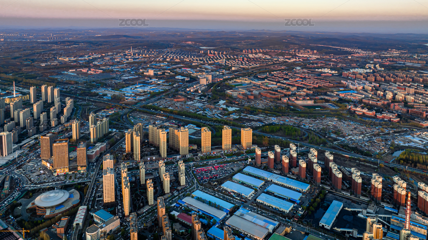 城市建設(shè)中高樓大廈日落航拍