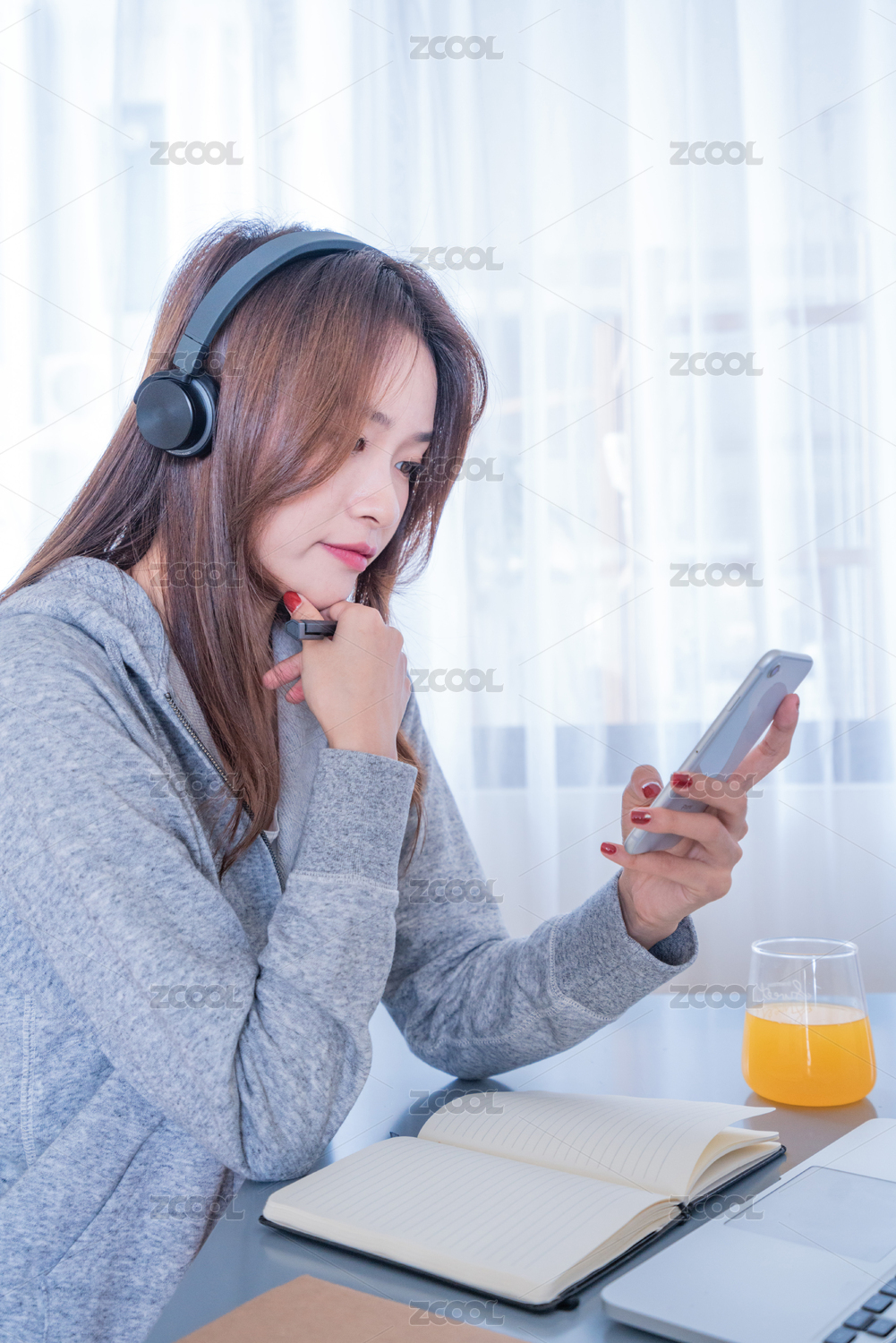 微笑使用電子學(xué)習(xí)系統(tǒng),看網(wǎng)上教學(xué)視頻學(xué)習(xí),并試圖講客廳英語年輕的大學(xué)女生。