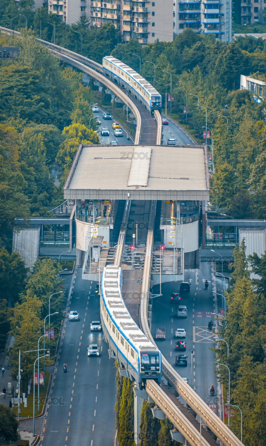 俯拍中國重慶輕軌3號線從樓宇之間穿過