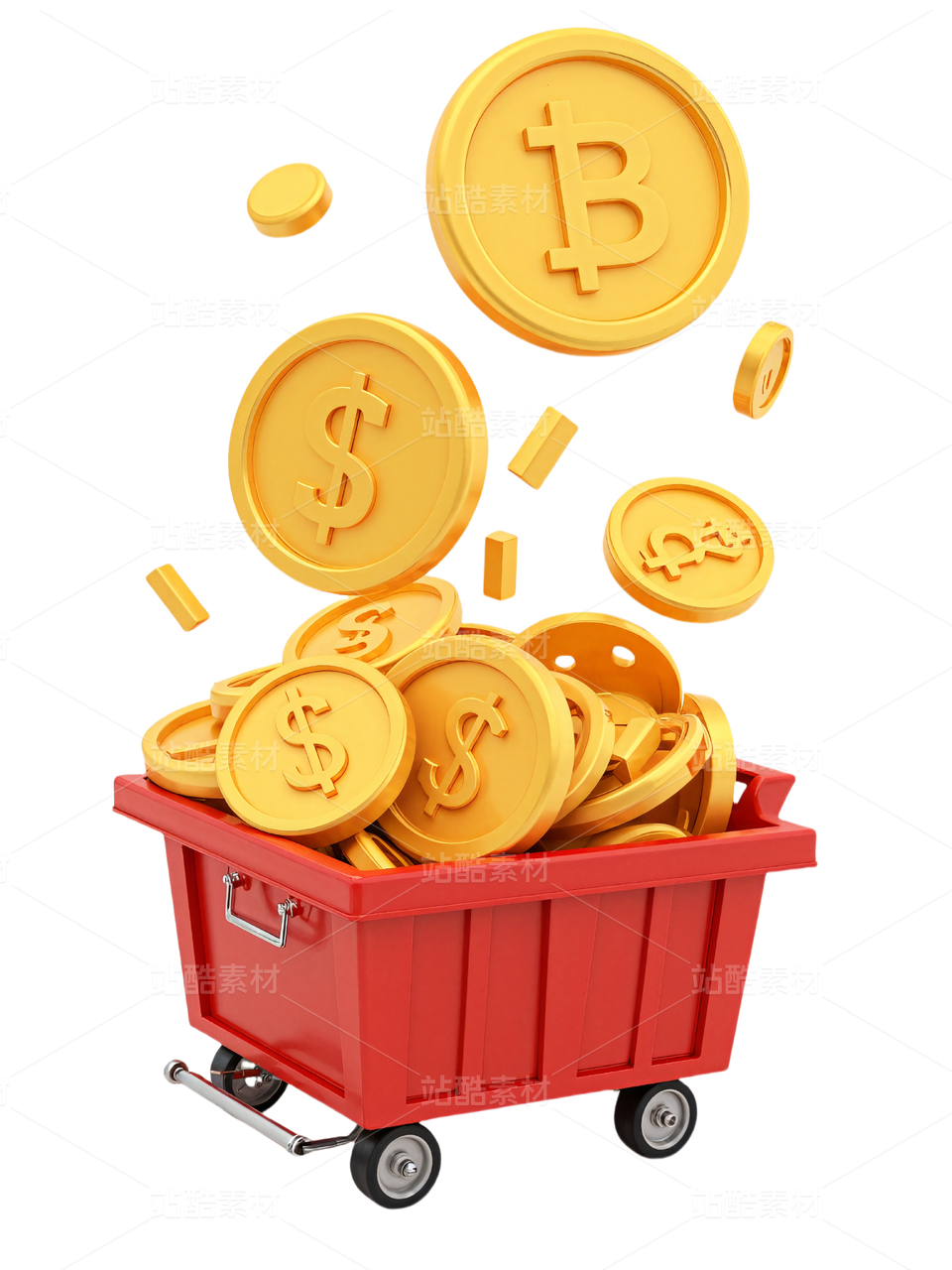 一個(gè)裝滿金幣的購(gòu)物車3D風(fēng)格PNG免摳素材