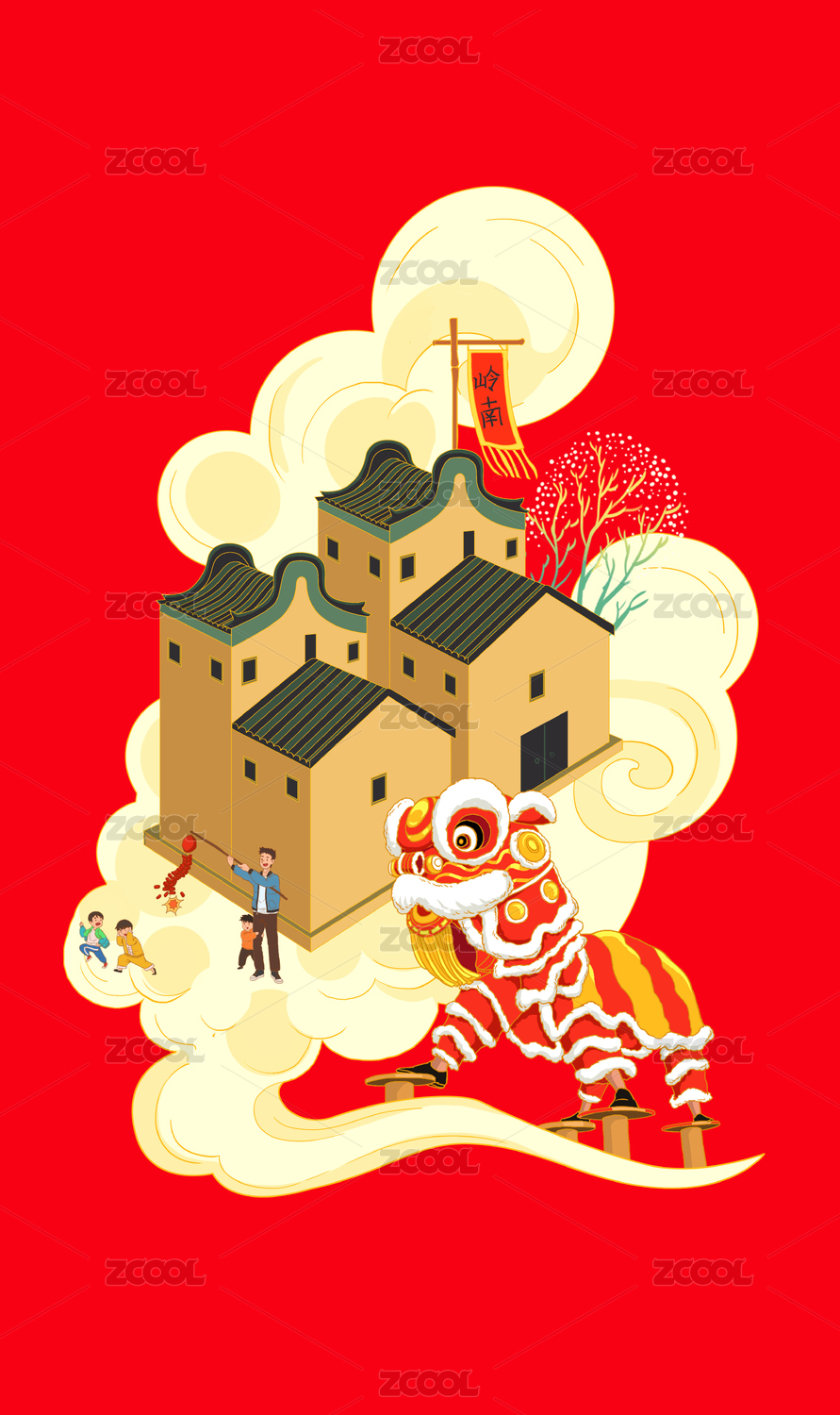 新年放鞭炮在云層上舞獅背后嶺南建筑