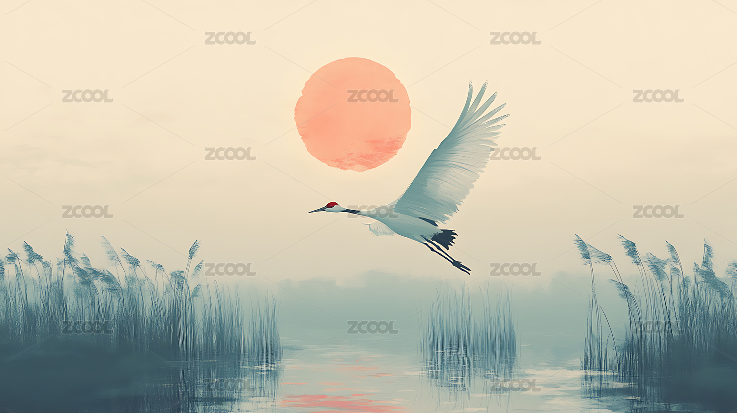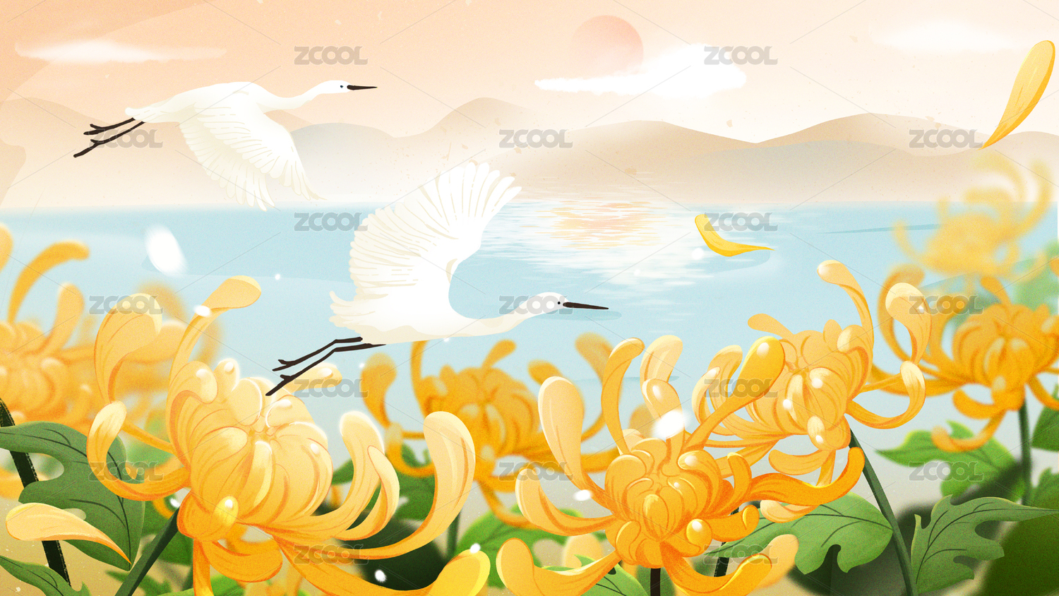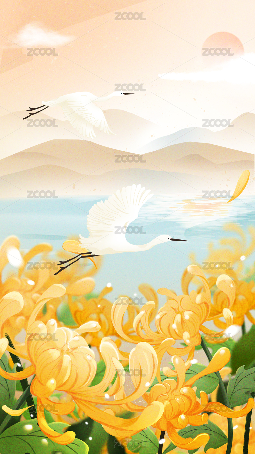 秋天菊花白鷺插畫(huà)背景