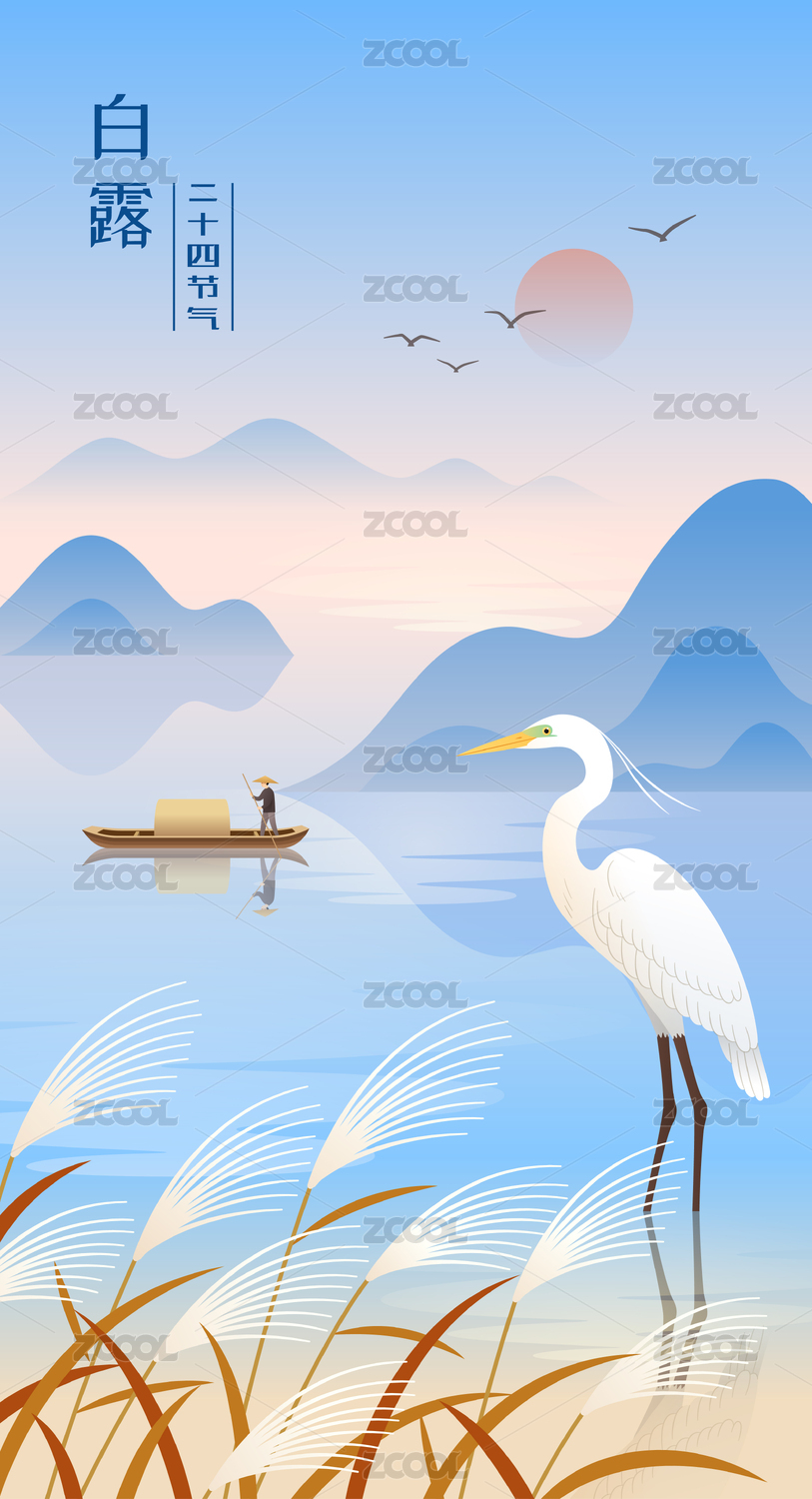 秋天白鷺和蘆葦小船等插畫(huà)