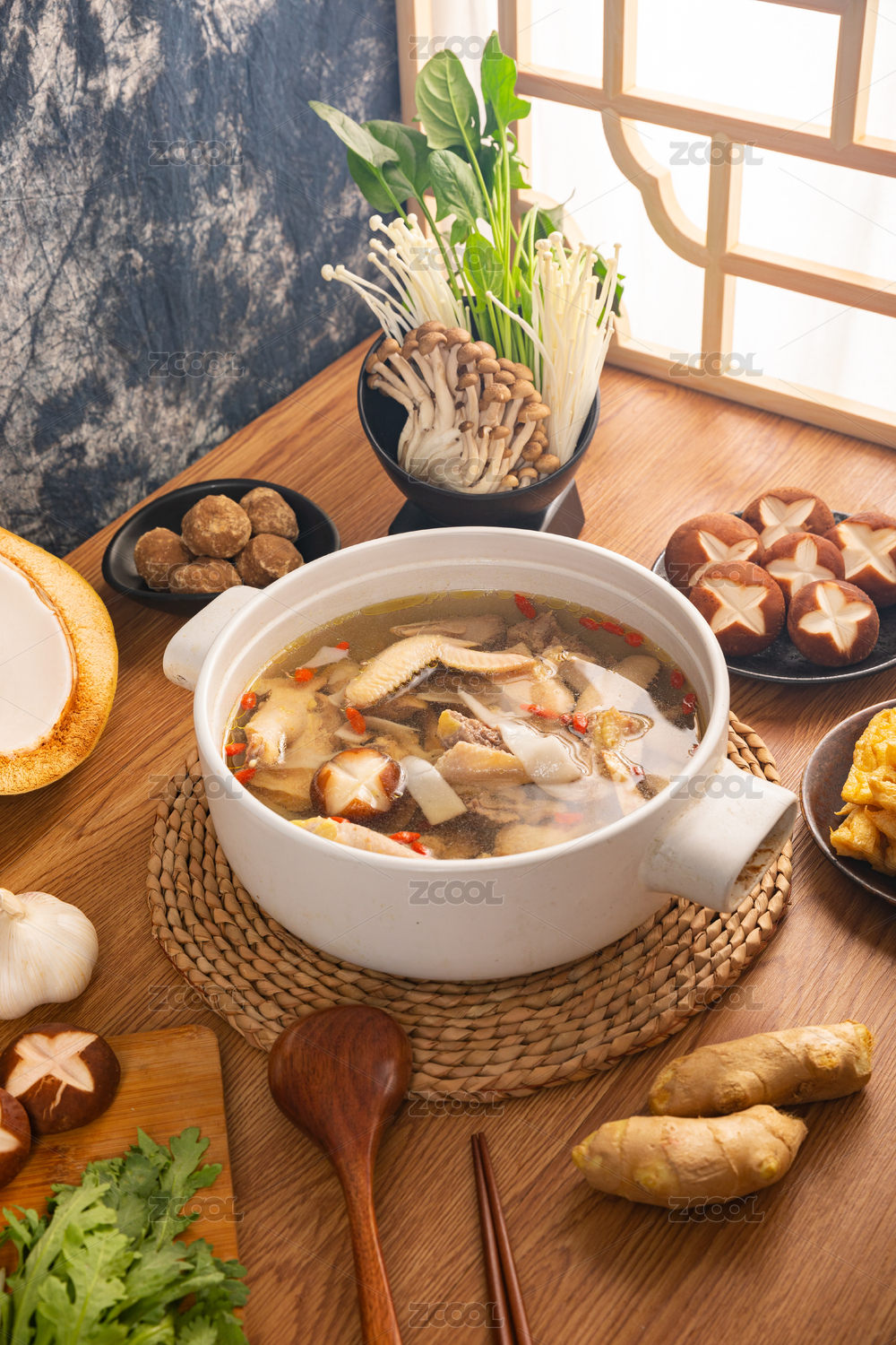 中式復(fù)古場景中的一鍋椰子燉雞和食材