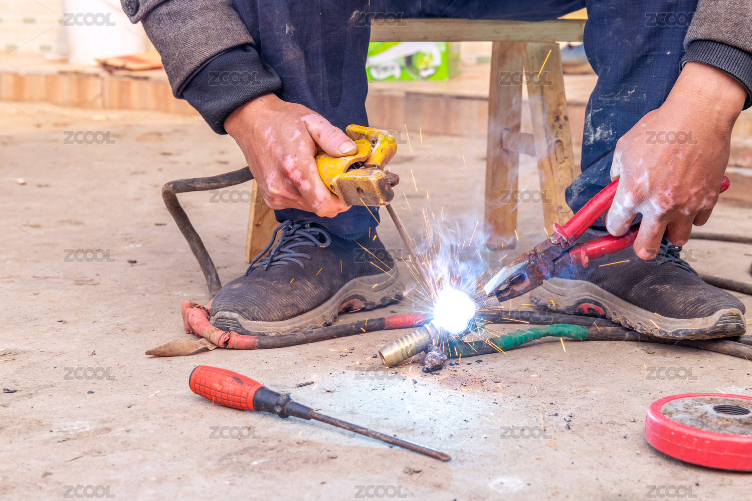 夏天電焊工人正在工地上作業(yè)