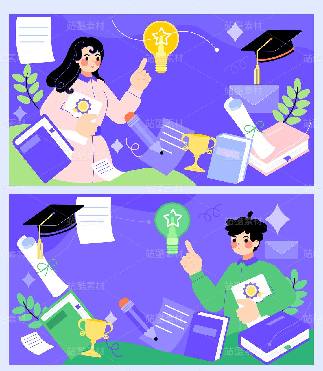 男學(xué)生和女學(xué)生書本學(xué)士帽獎杯教育矢量插畫