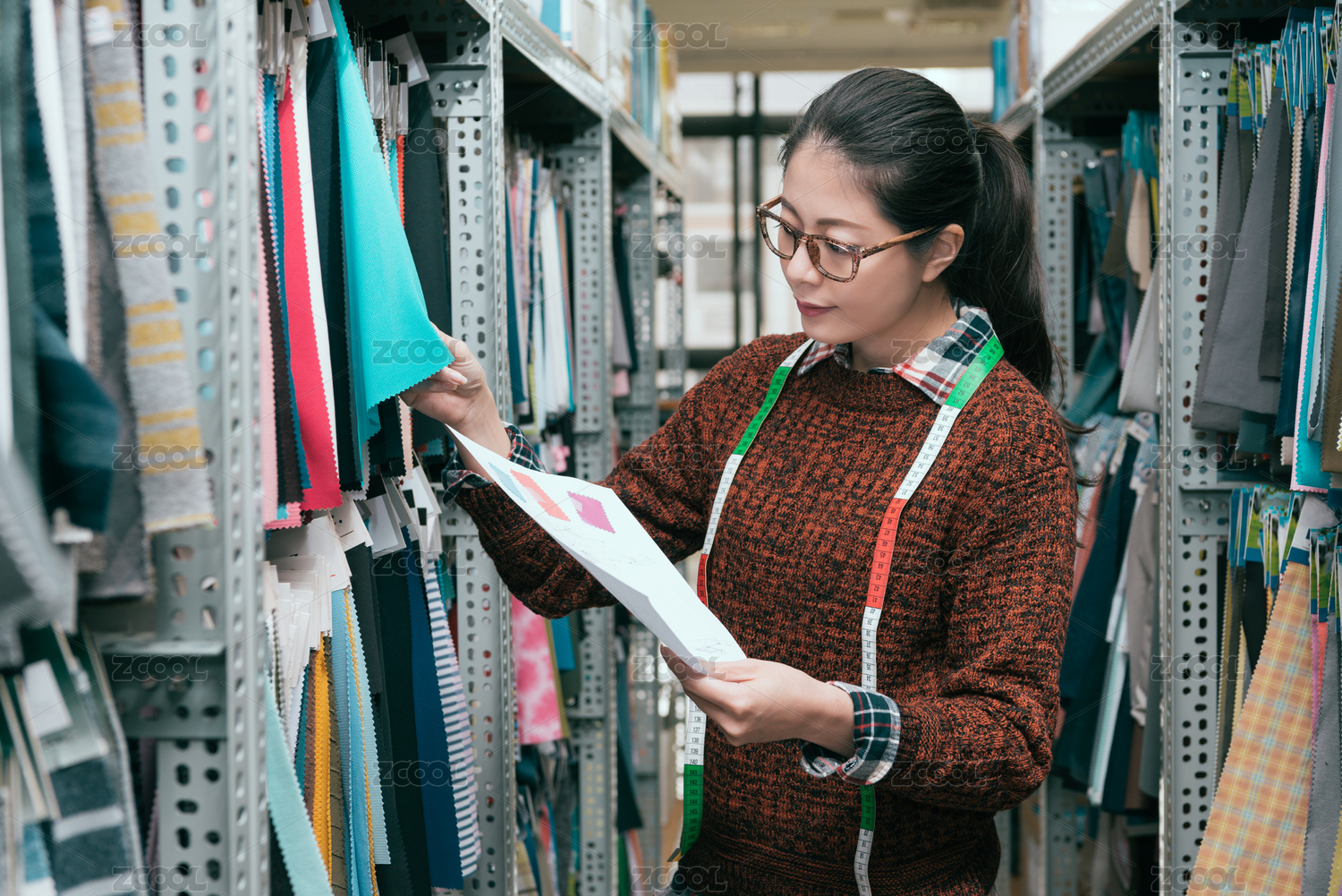 專業(yè)的年輕女性服裝公司職工找論文樣本選擇在工廠面料區(qū)右布料。