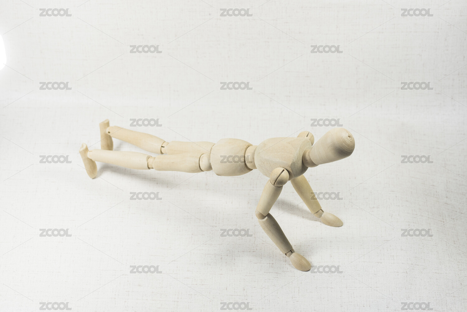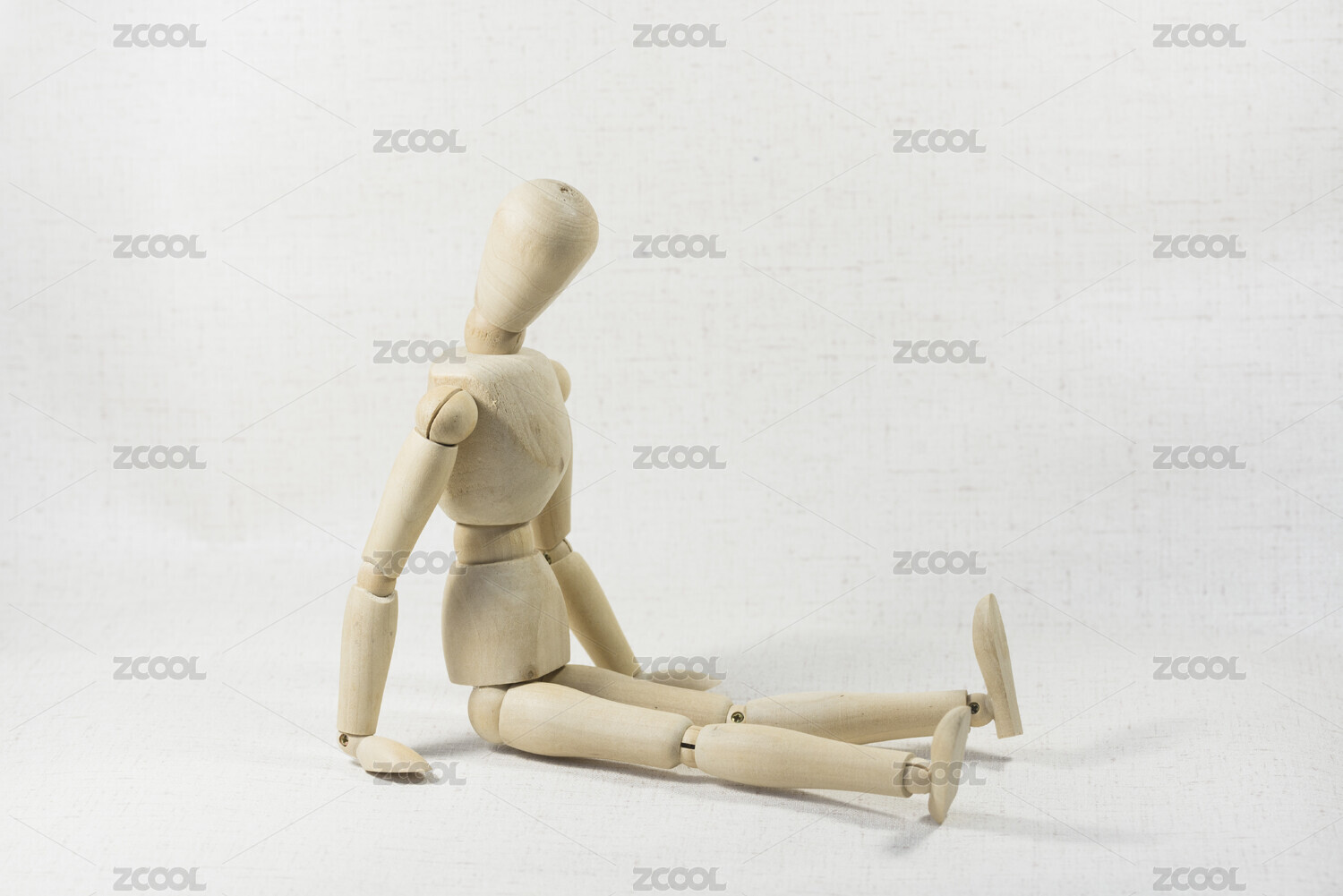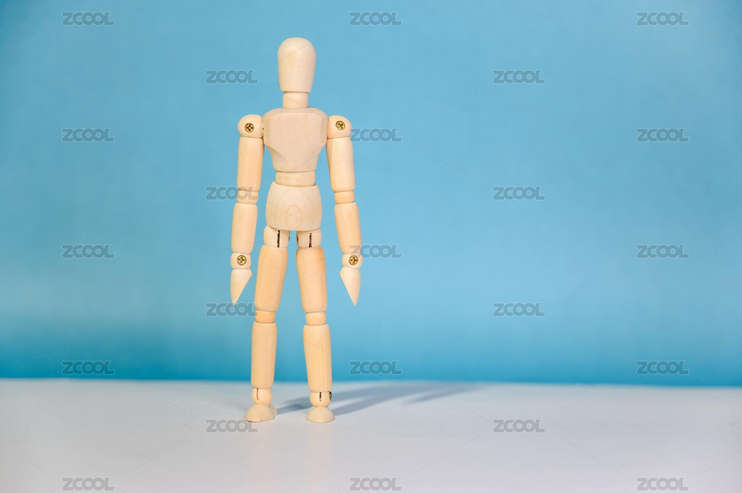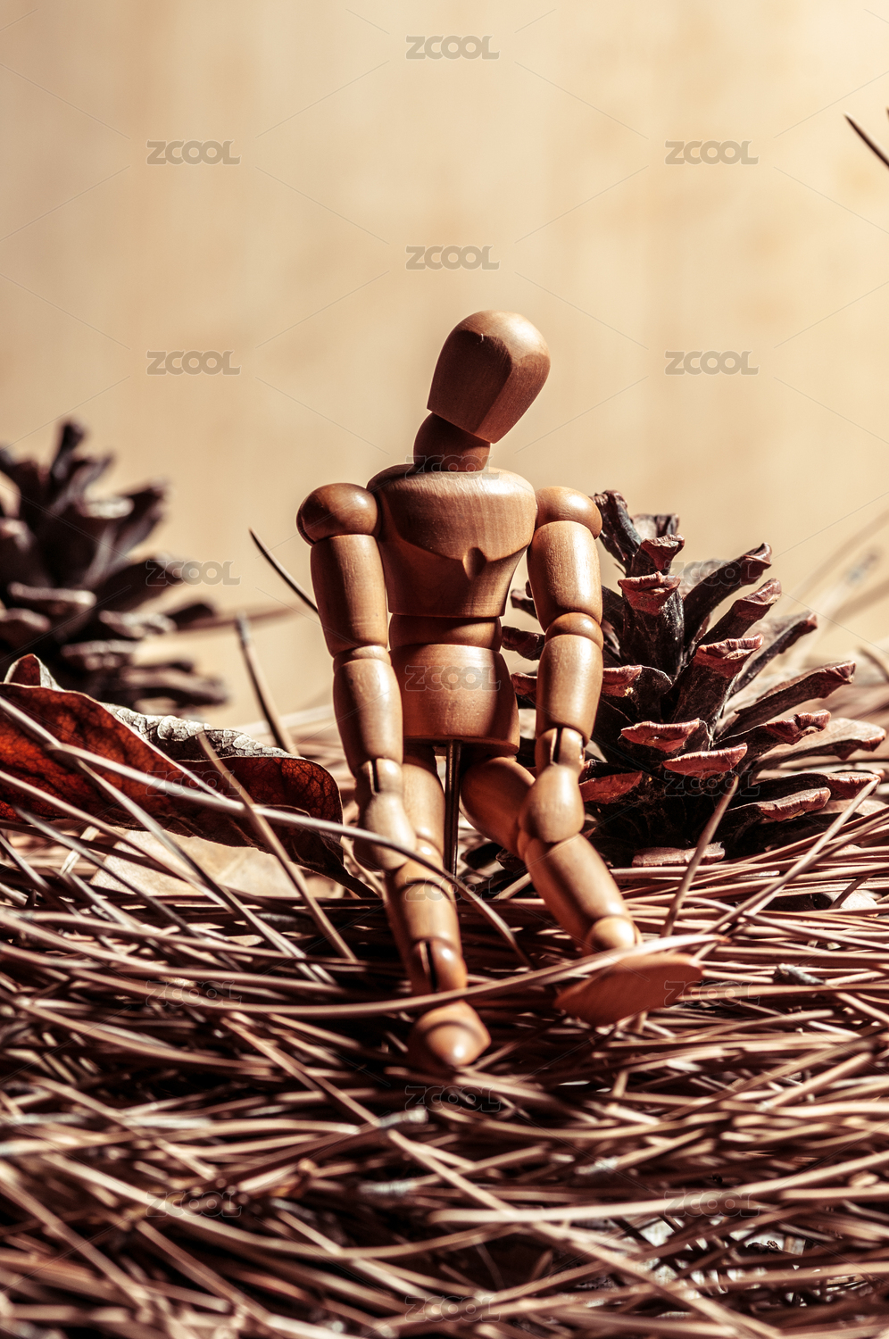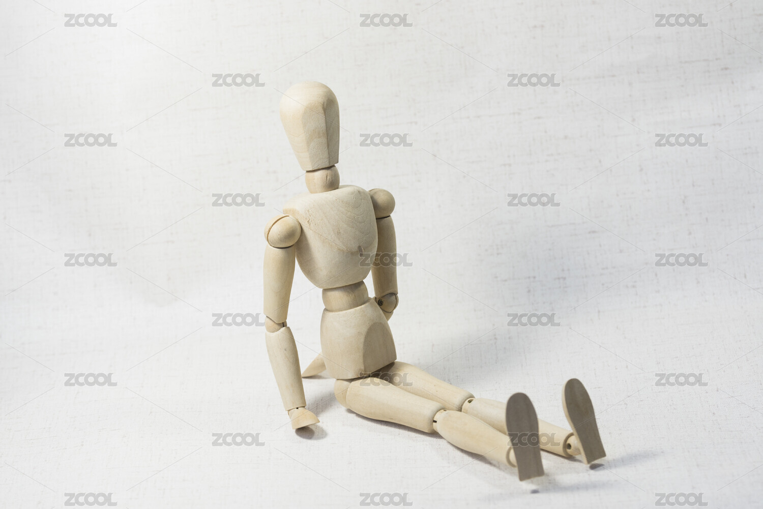 筆記本電腦與側(cè)坐的木偶模型靜物特寫