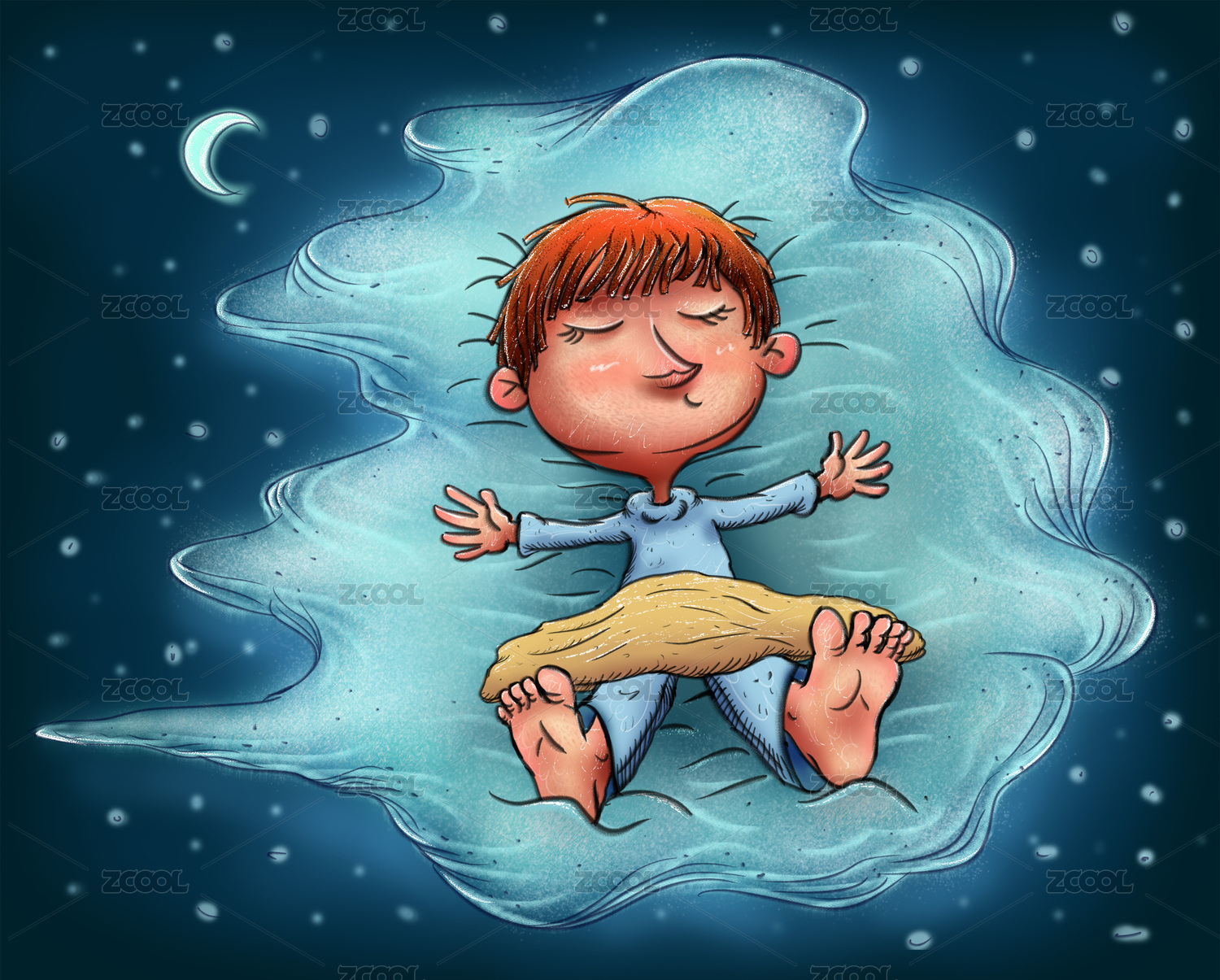 男孩蓋著小被子大字型在夜晚的云上躺著睡覺