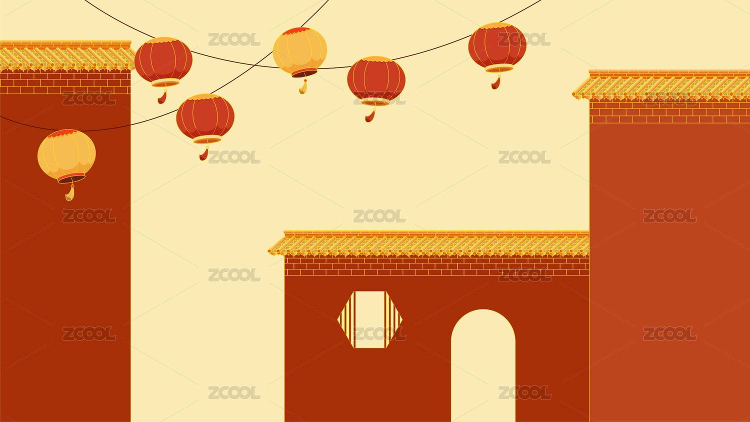 紅金色古建筑城墻和燈籠背景矢量插畫