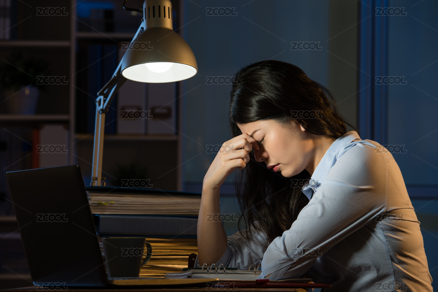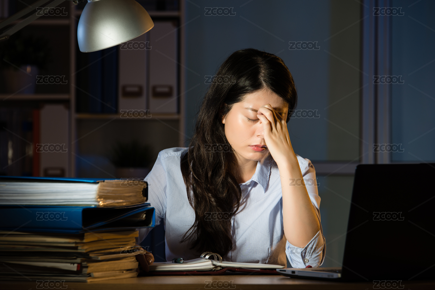 亞裔女商人坐在辦公桌頭痛加班深夜。在室內(nèi)辦公背景