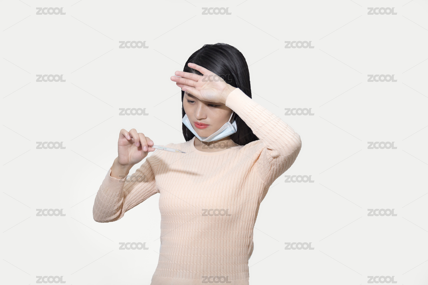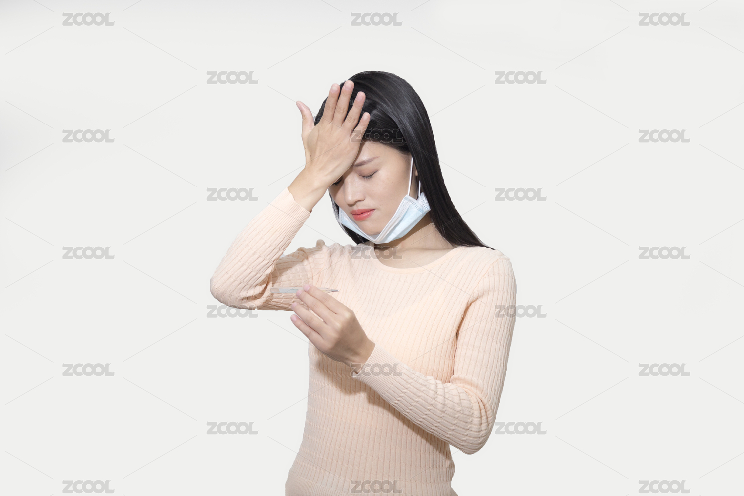 頭痛戴口罩的長頭發(fā)東方女人