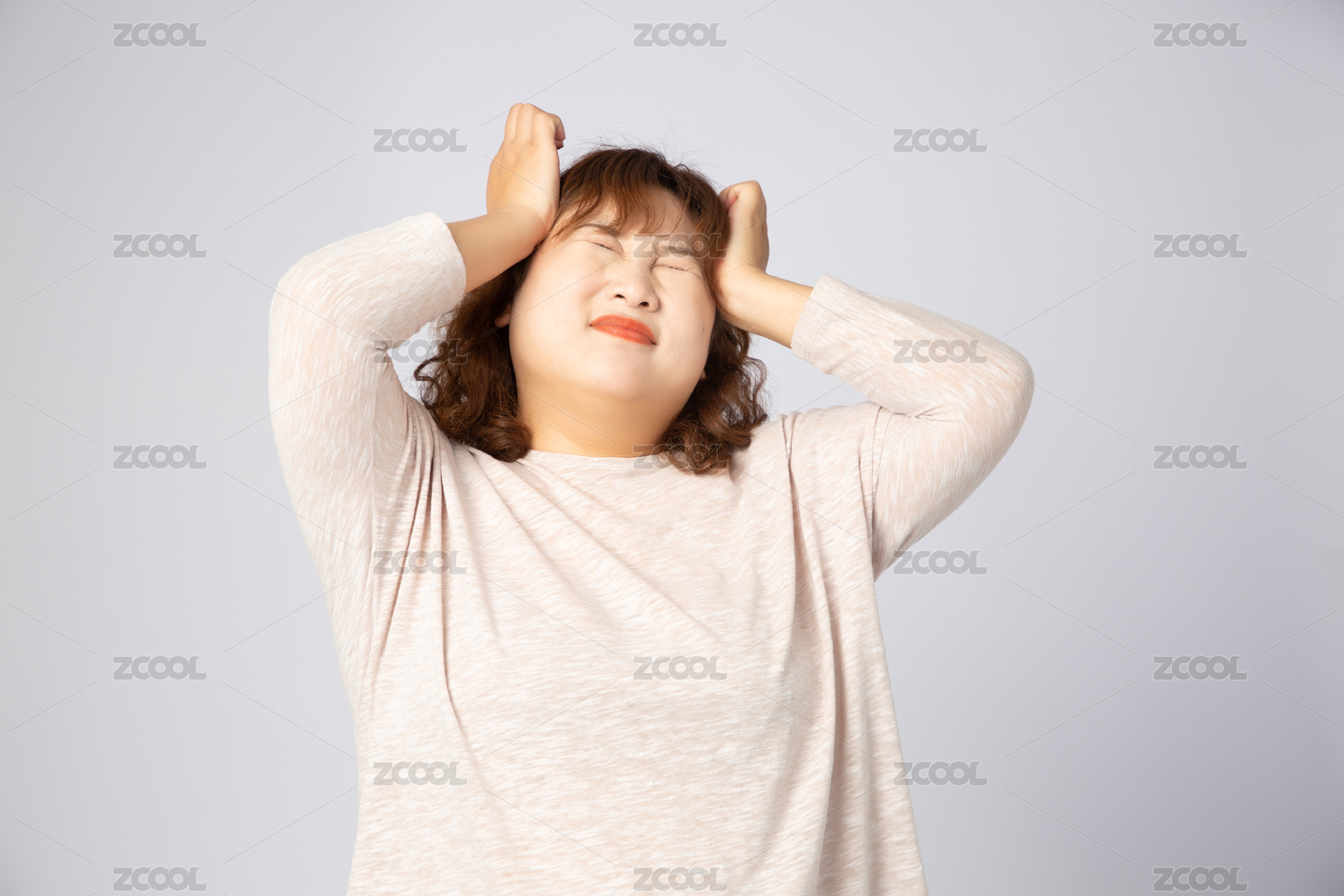 一個(gè)亞洲女人摸著自己的疼痛頭痛頭疼的腦袋,感覺很難受很煩躁