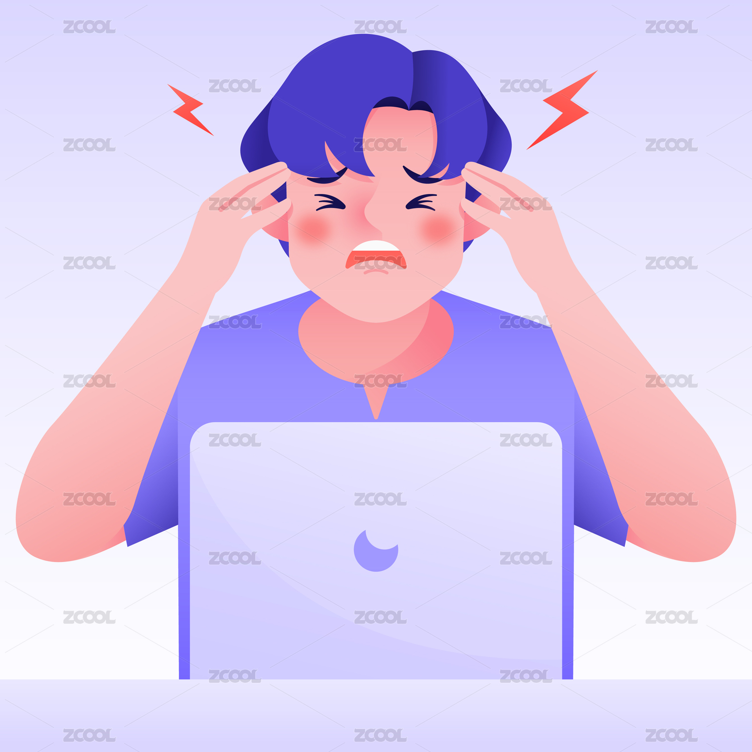 男生坐在電腦前頭痛頭暈精神狀態(tài)不佳矢量