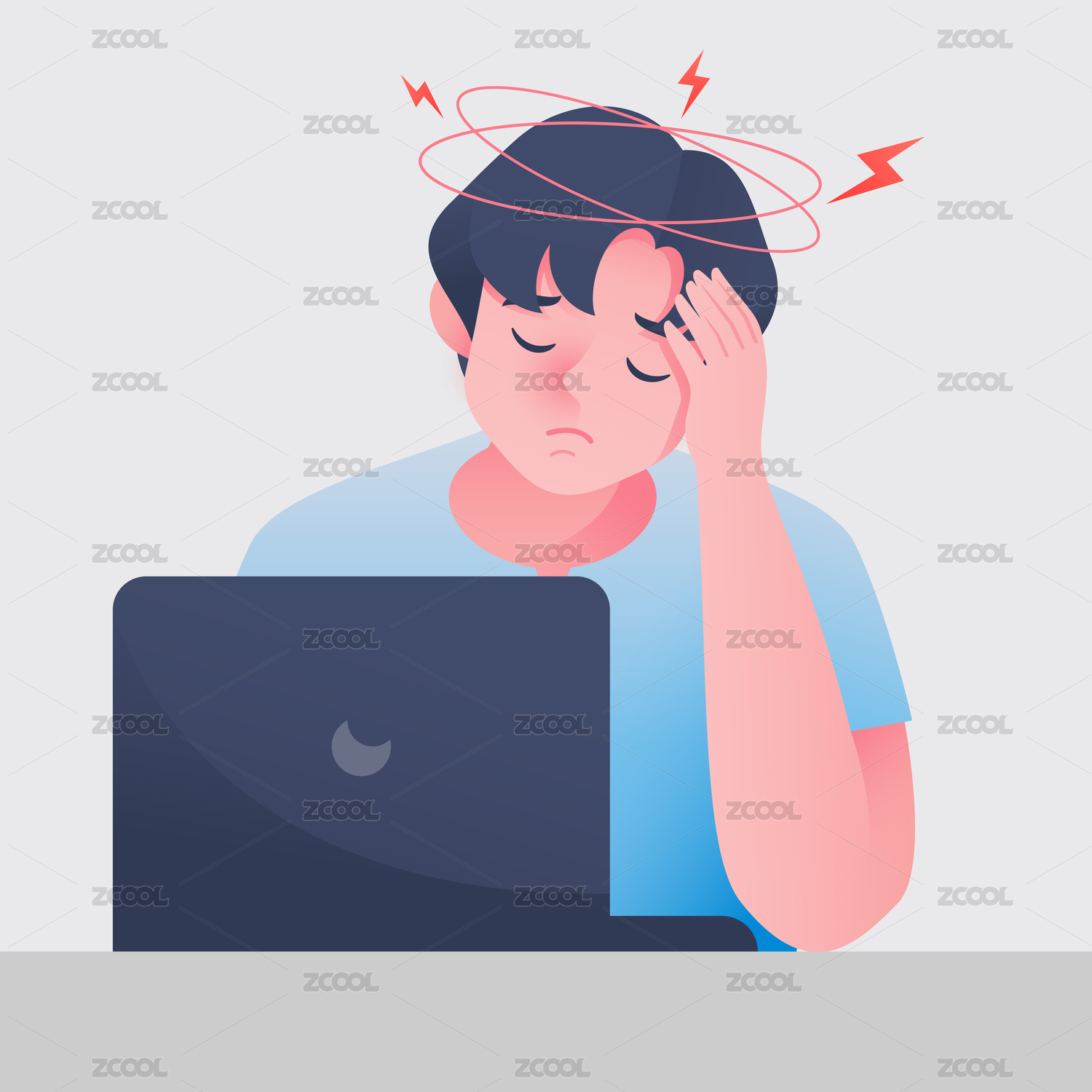 男生坐在電腦前頭暈頭痛疲憊狀態(tài)矢量插畫