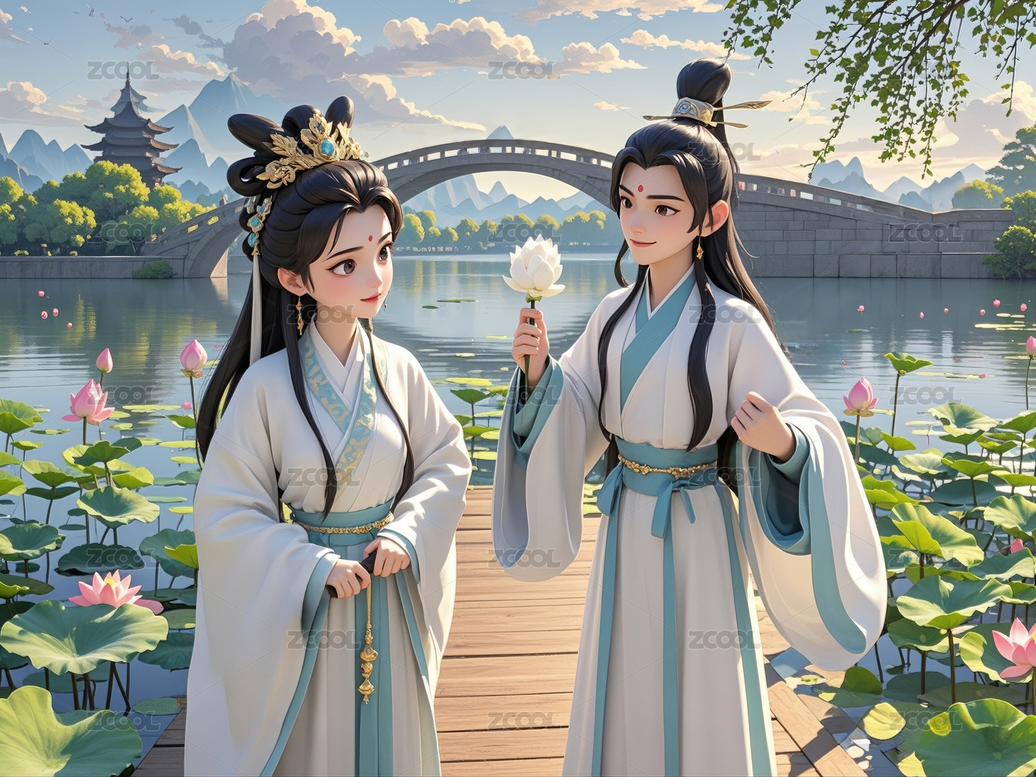 戲曲武松打虎許仙與白娘子橋頭,水彩水墨畫(huà)