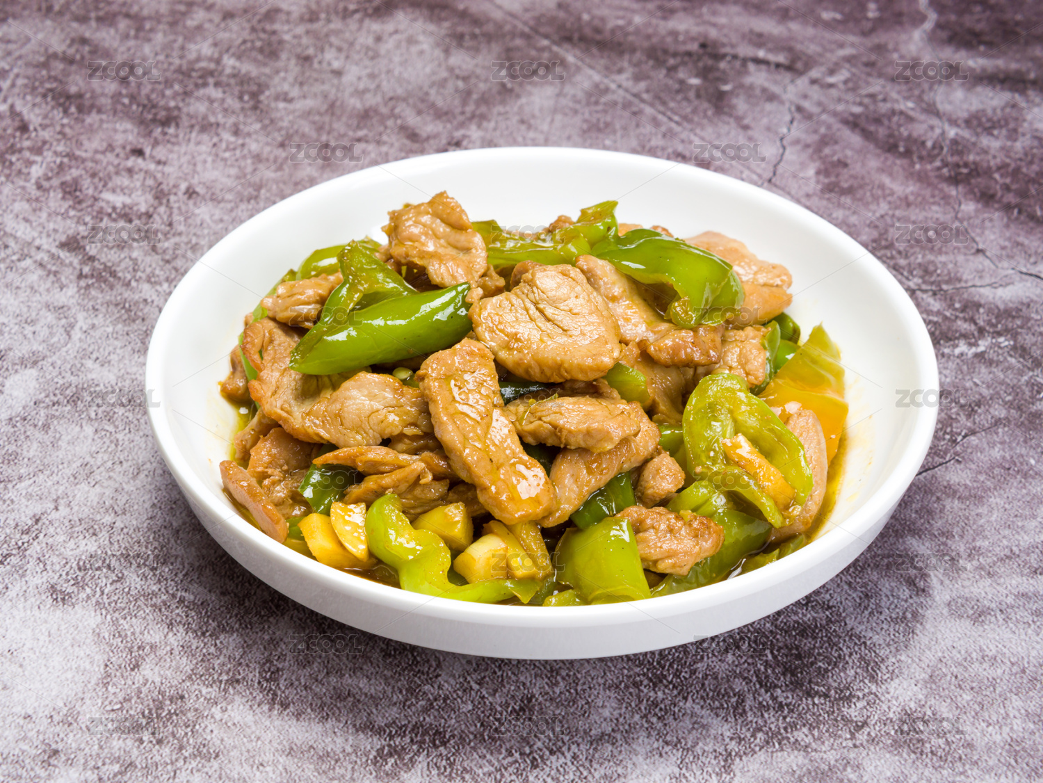 放在盤子里的湖南小炒肉青椒炒肉側(cè)拍
