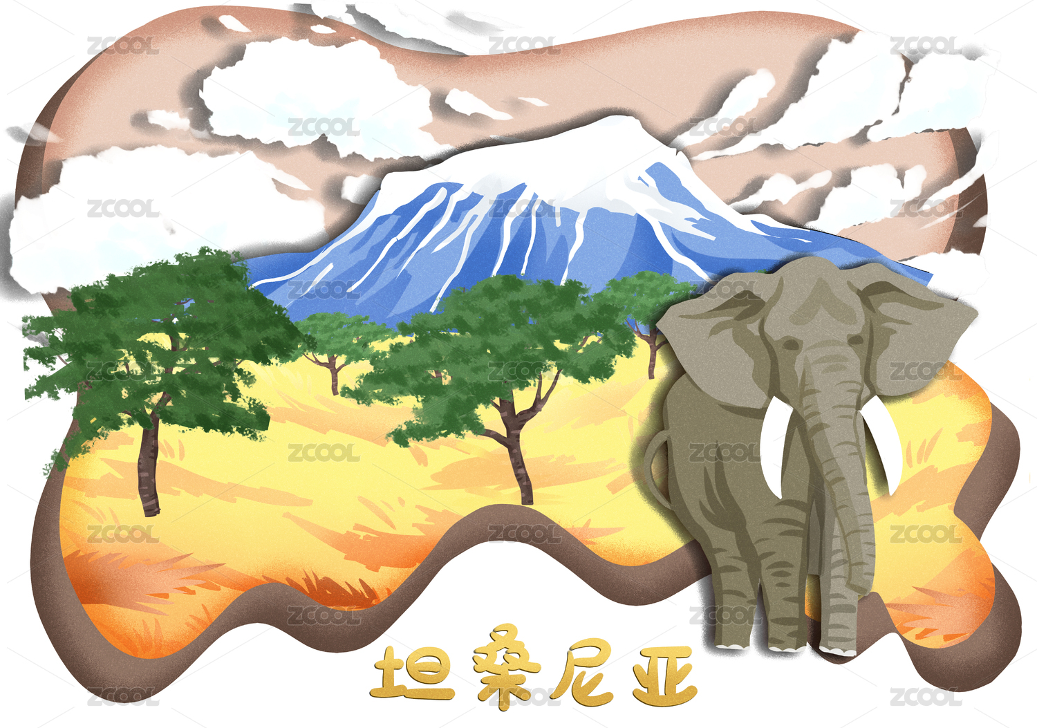 剪紙風格坦桑尼亞國家地標乞力馬扎羅山與非洲大草原野象插畫