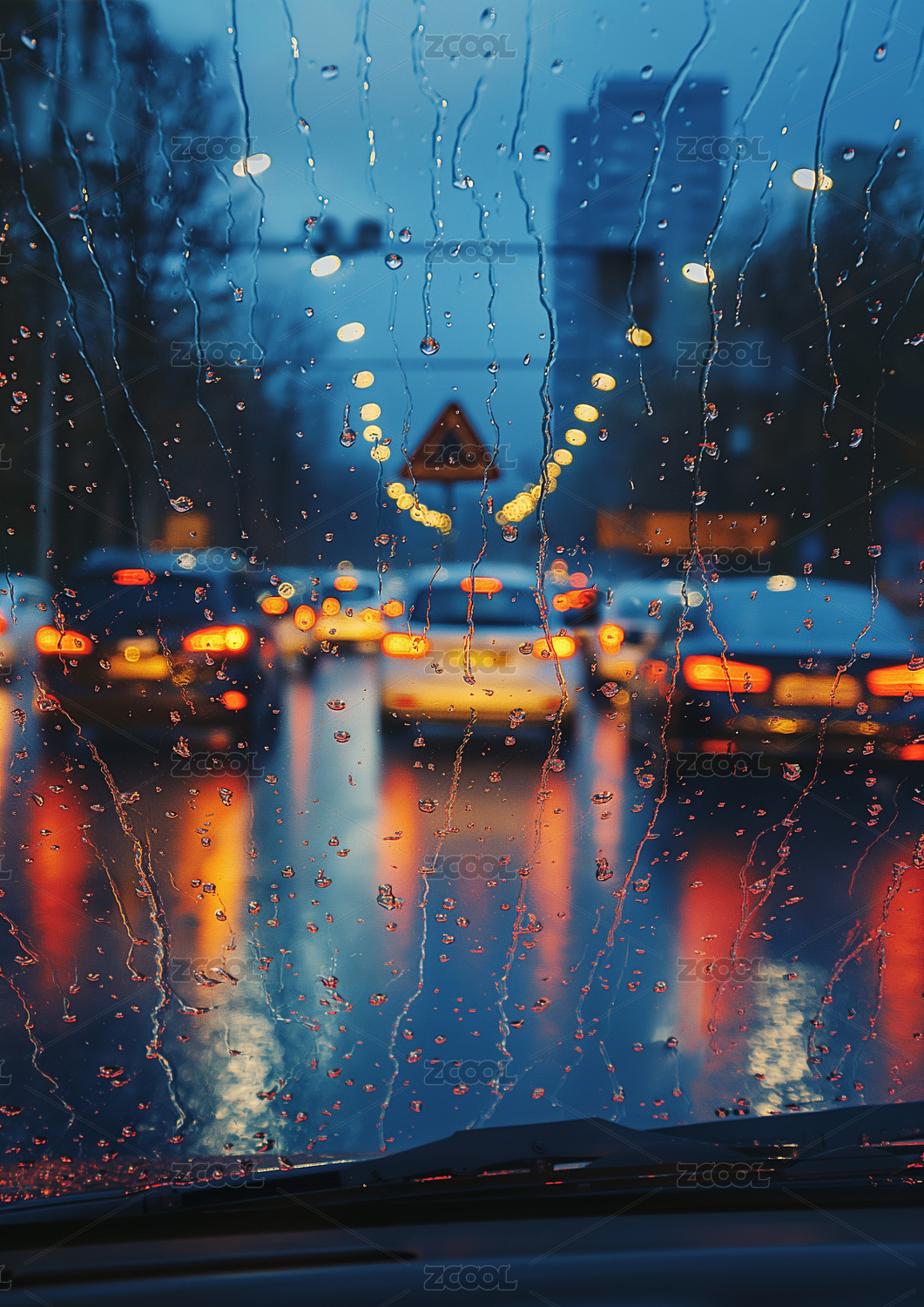下雨天開車公路上雨水灑在車玻璃上