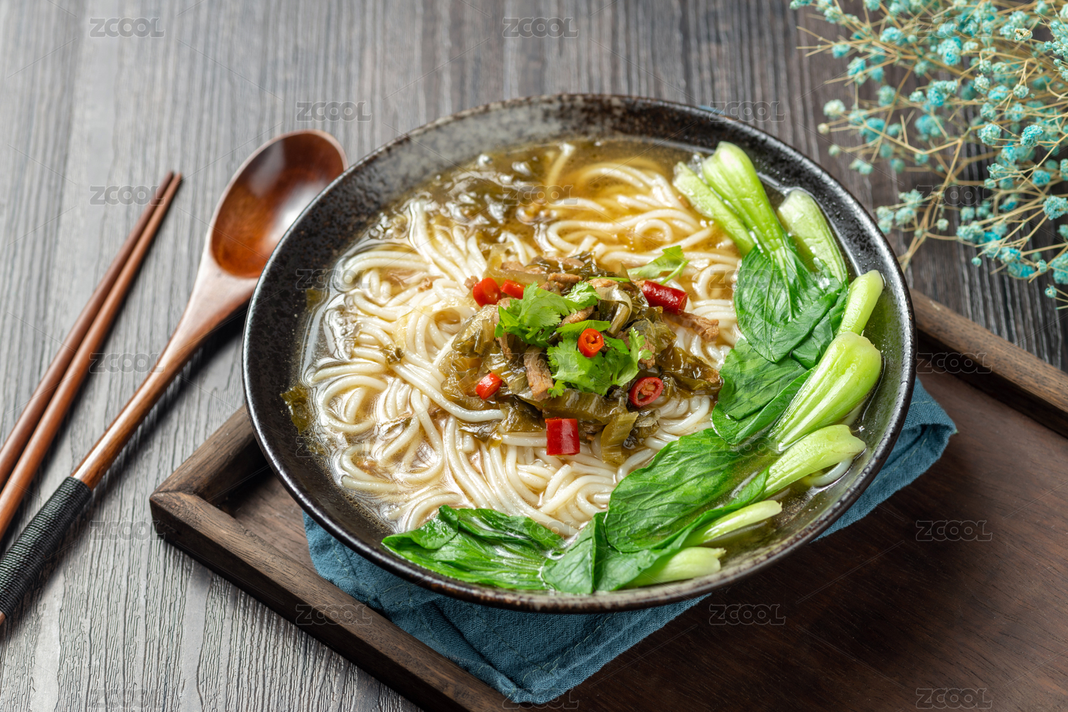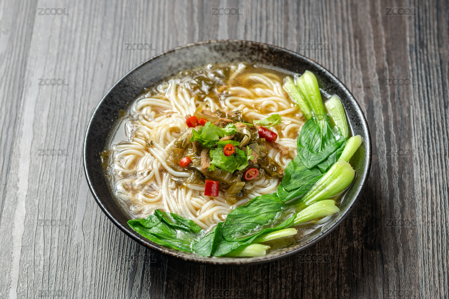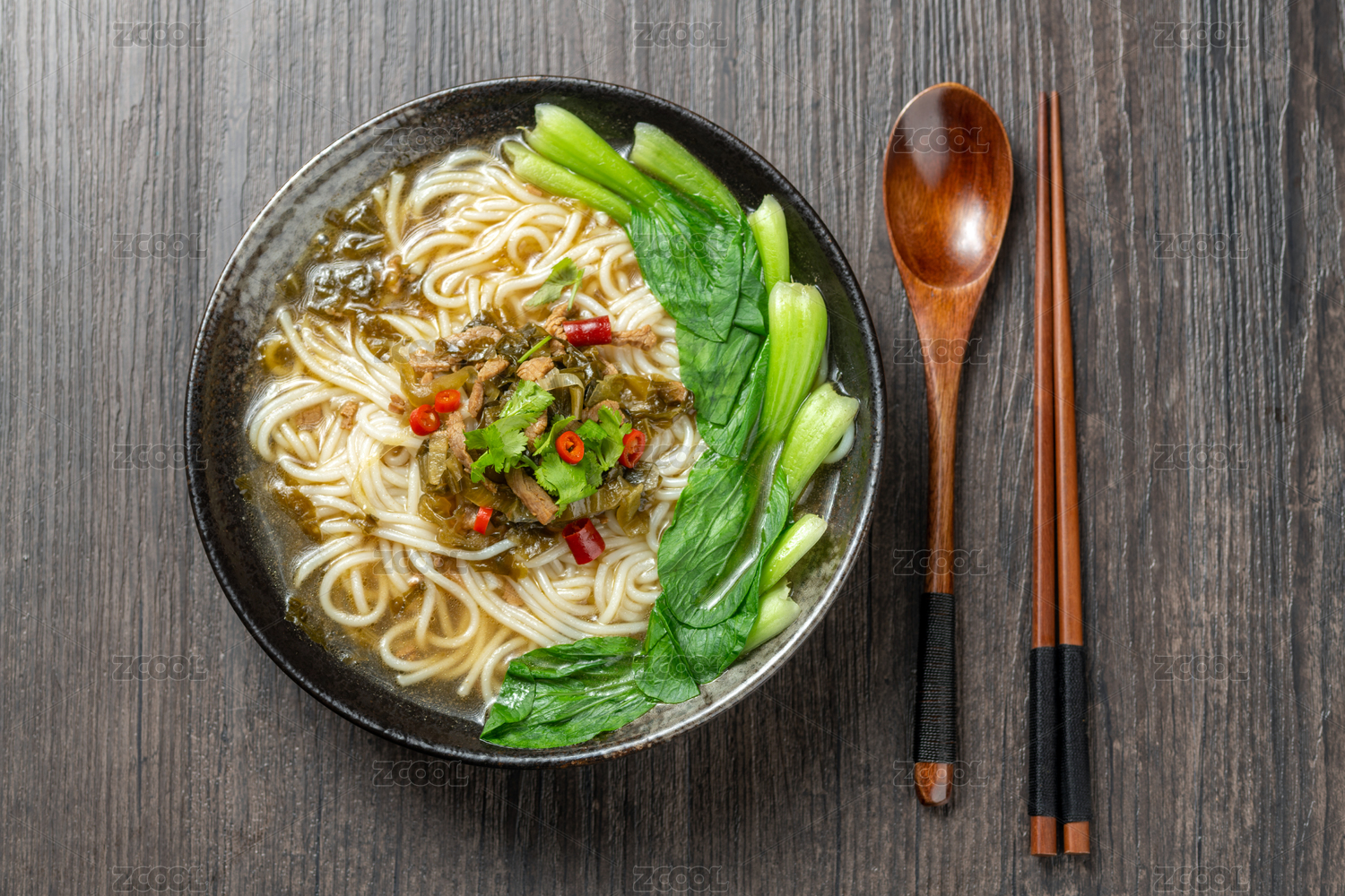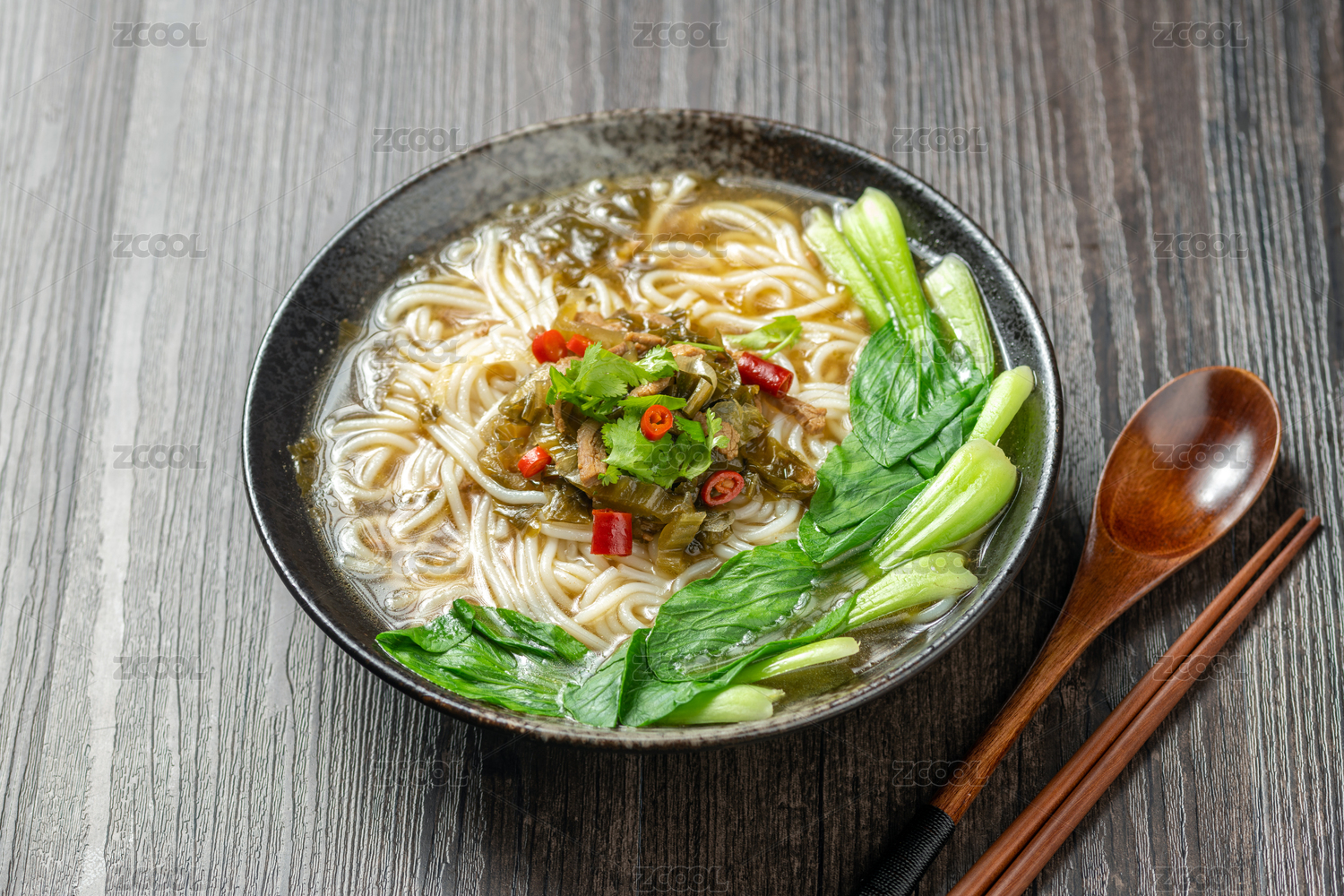 一碗酸菜肉絲米線擺放在木桌面上
