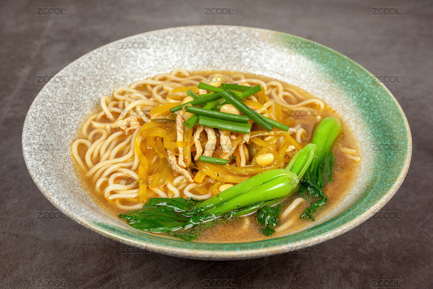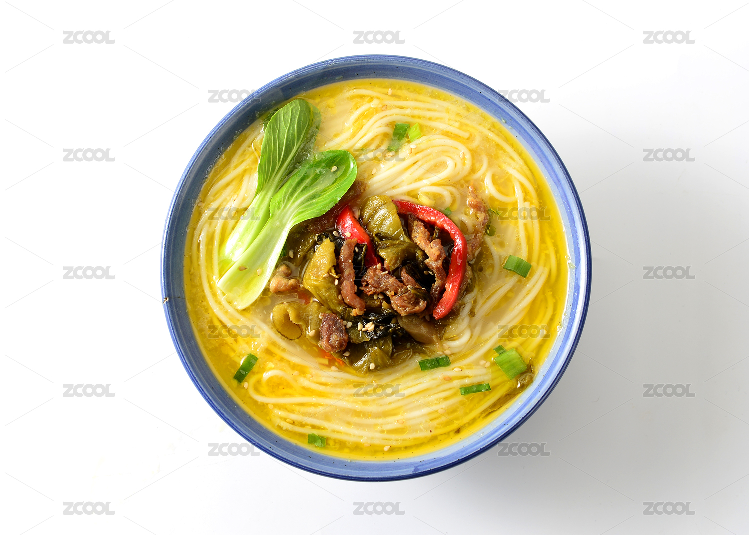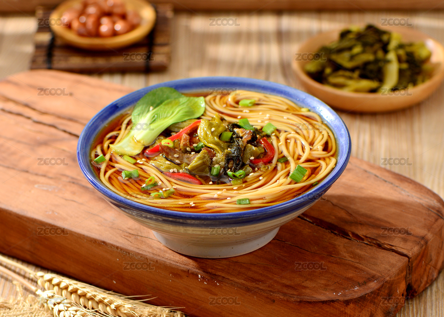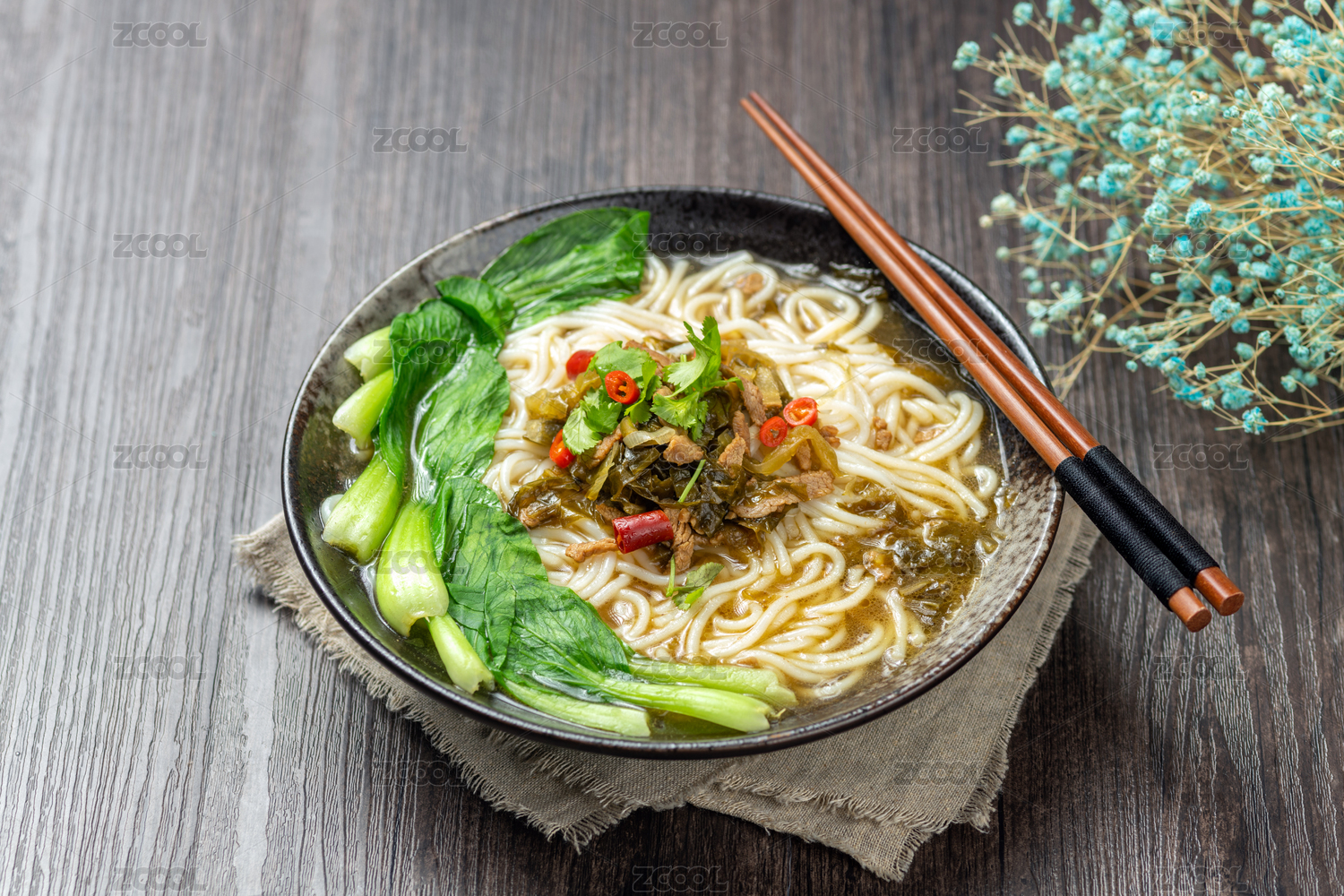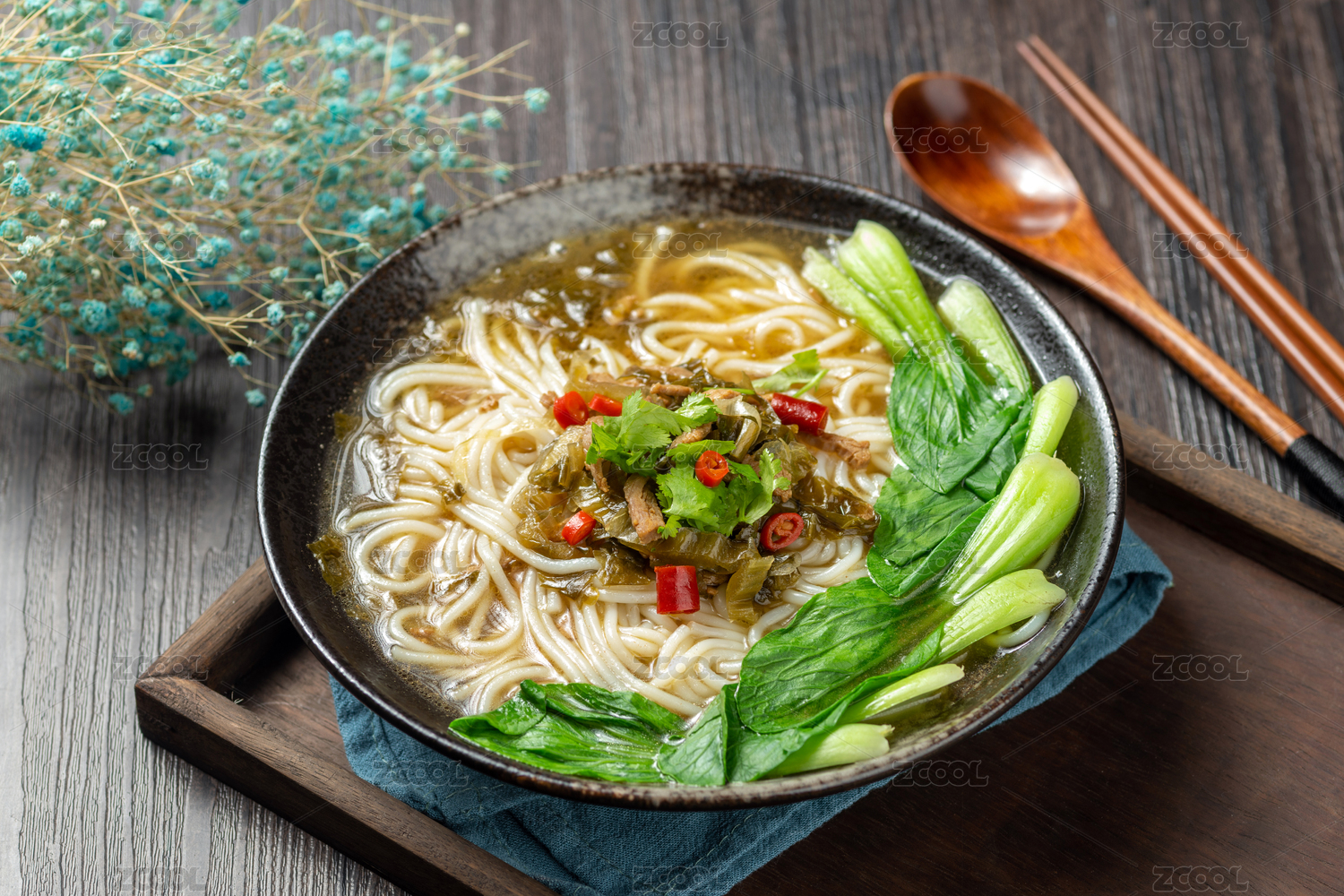 一碗酸菜肉絲米線擺放在木桌面上
