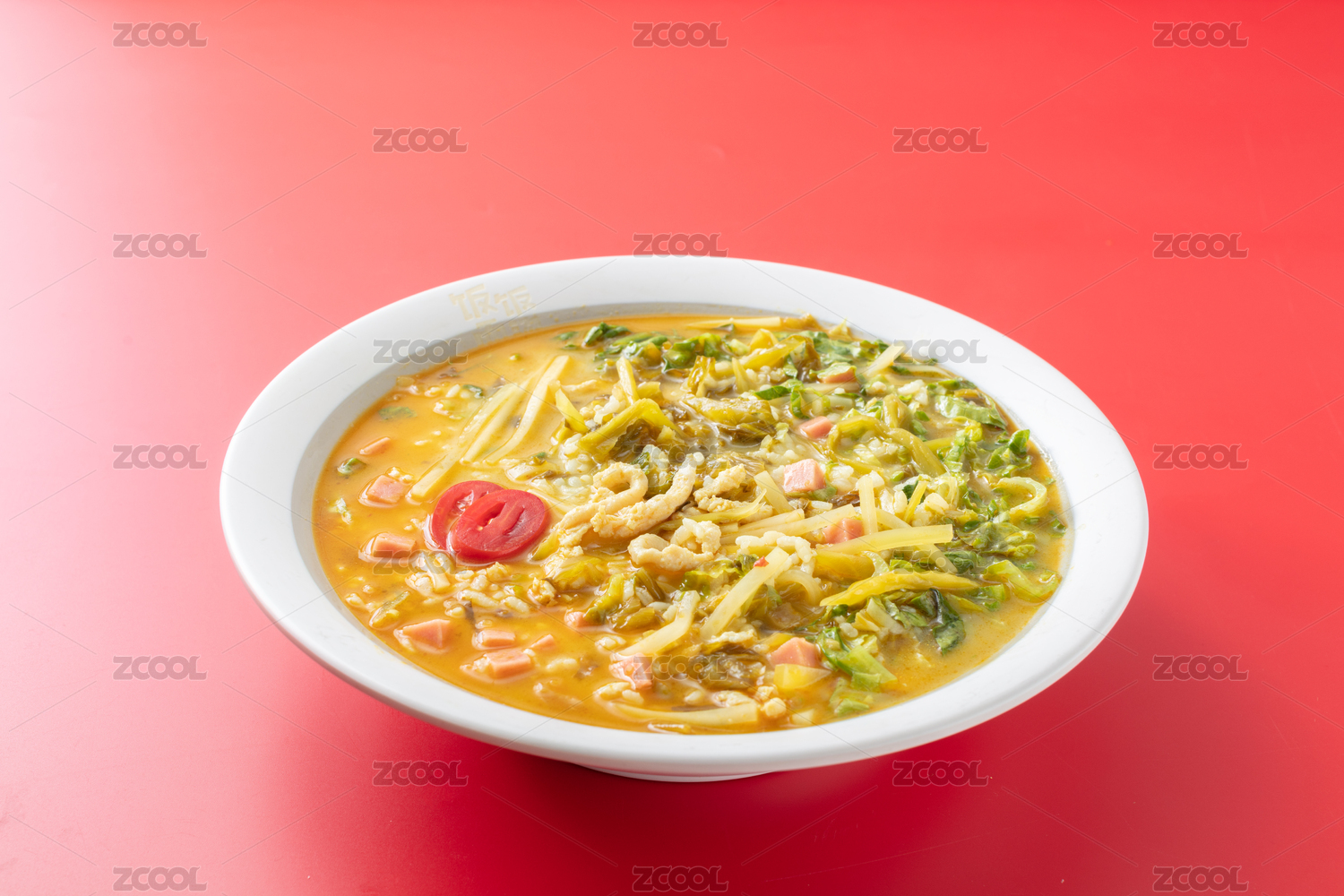 白色大碗里的金湯酸菜肉絲湯飯