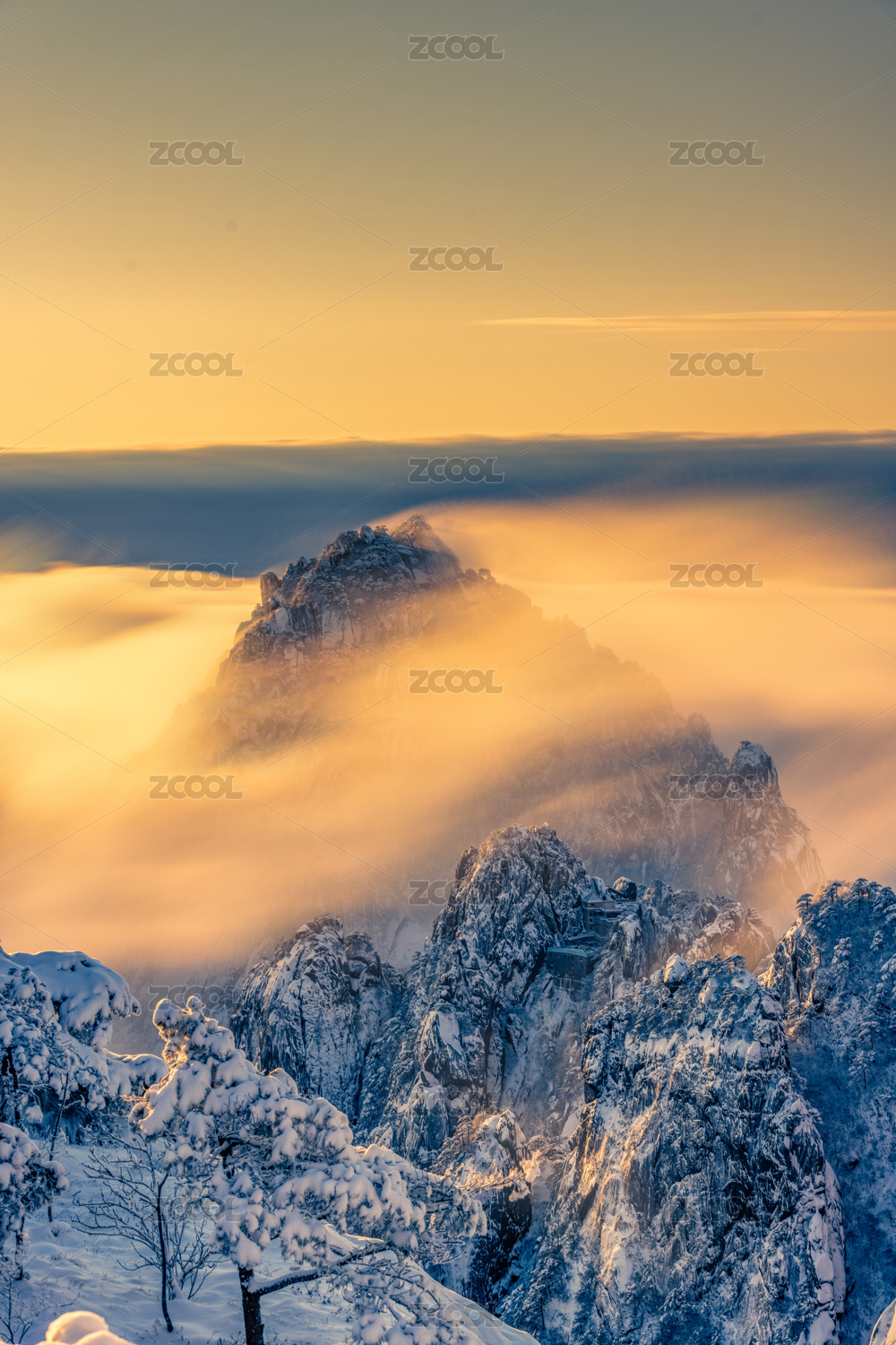 中國(guó)安徽黃山市黃山雪景夕陽(yáng)日出