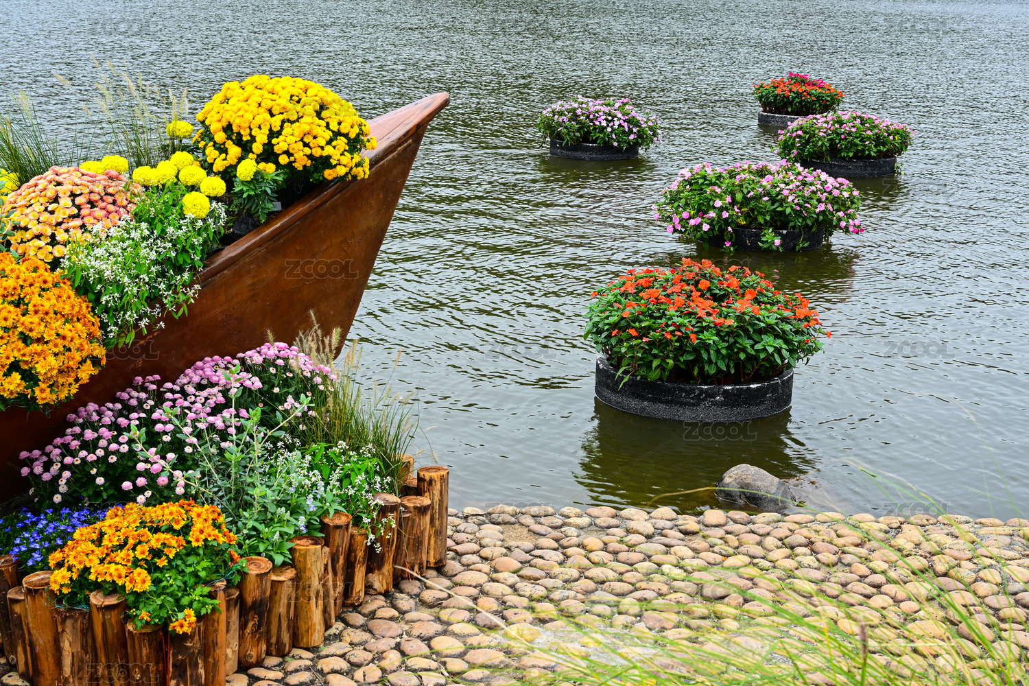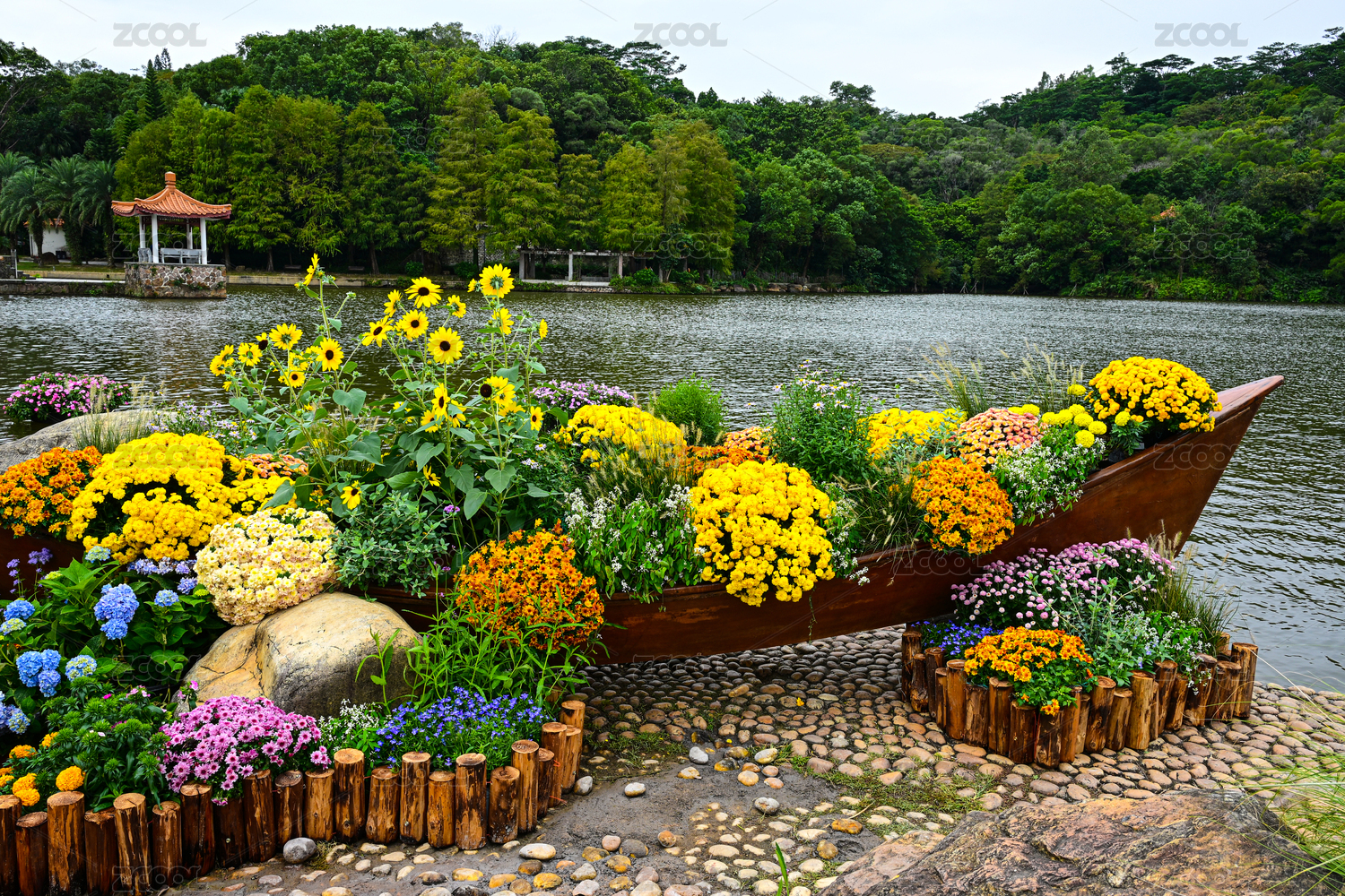 深圳仙湖植物園湖邊花卉裝飾的花船景觀