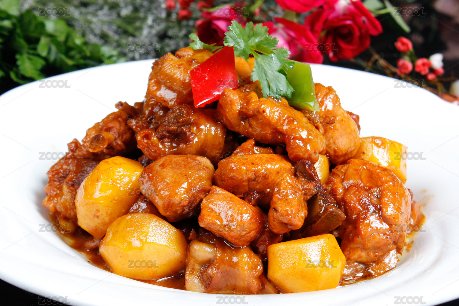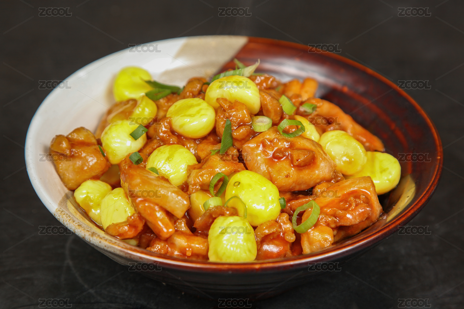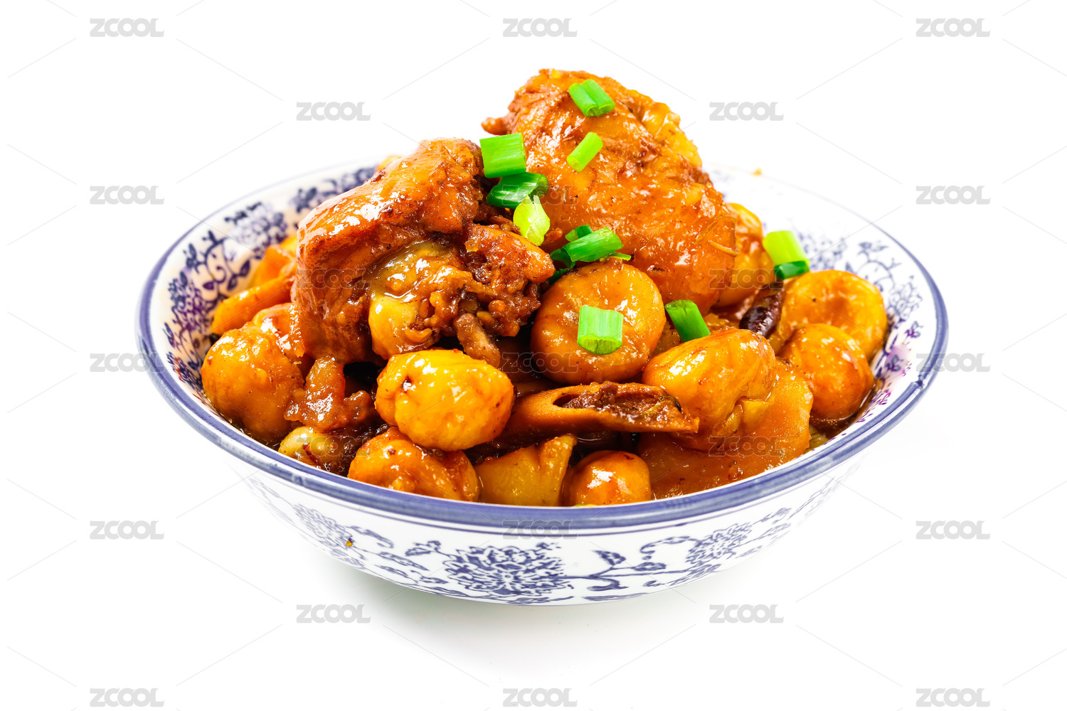 白色背景板栗燒雞
