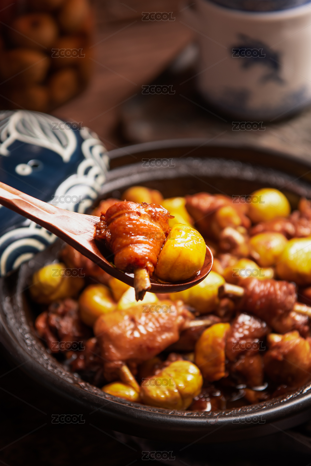 中式廚房砂鍋里的板栗燒雞