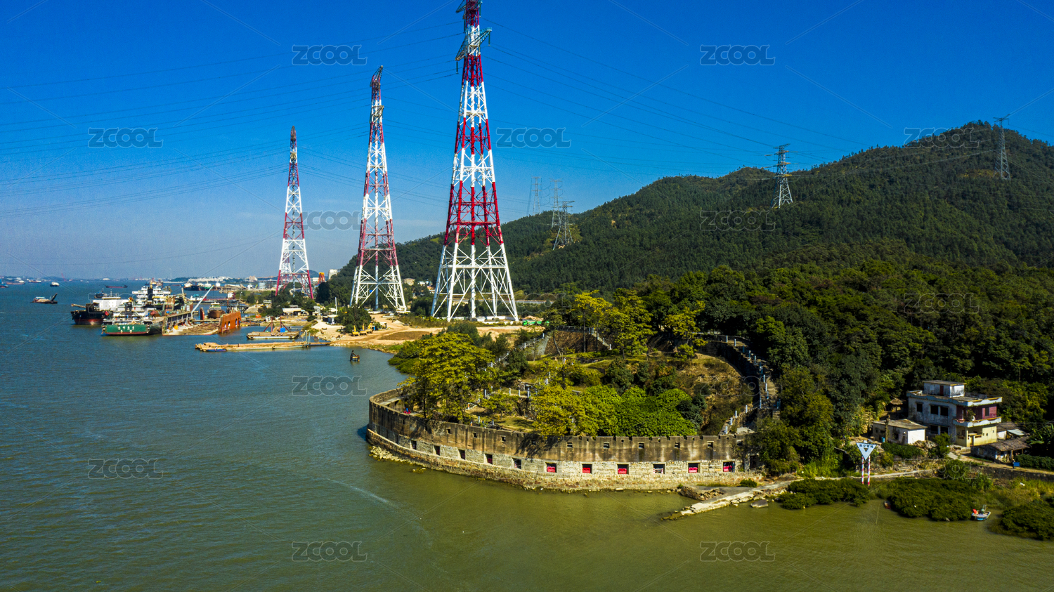中國廣東江門新會(huì)城市風(fēng)光崖門炮臺(tái)航拍