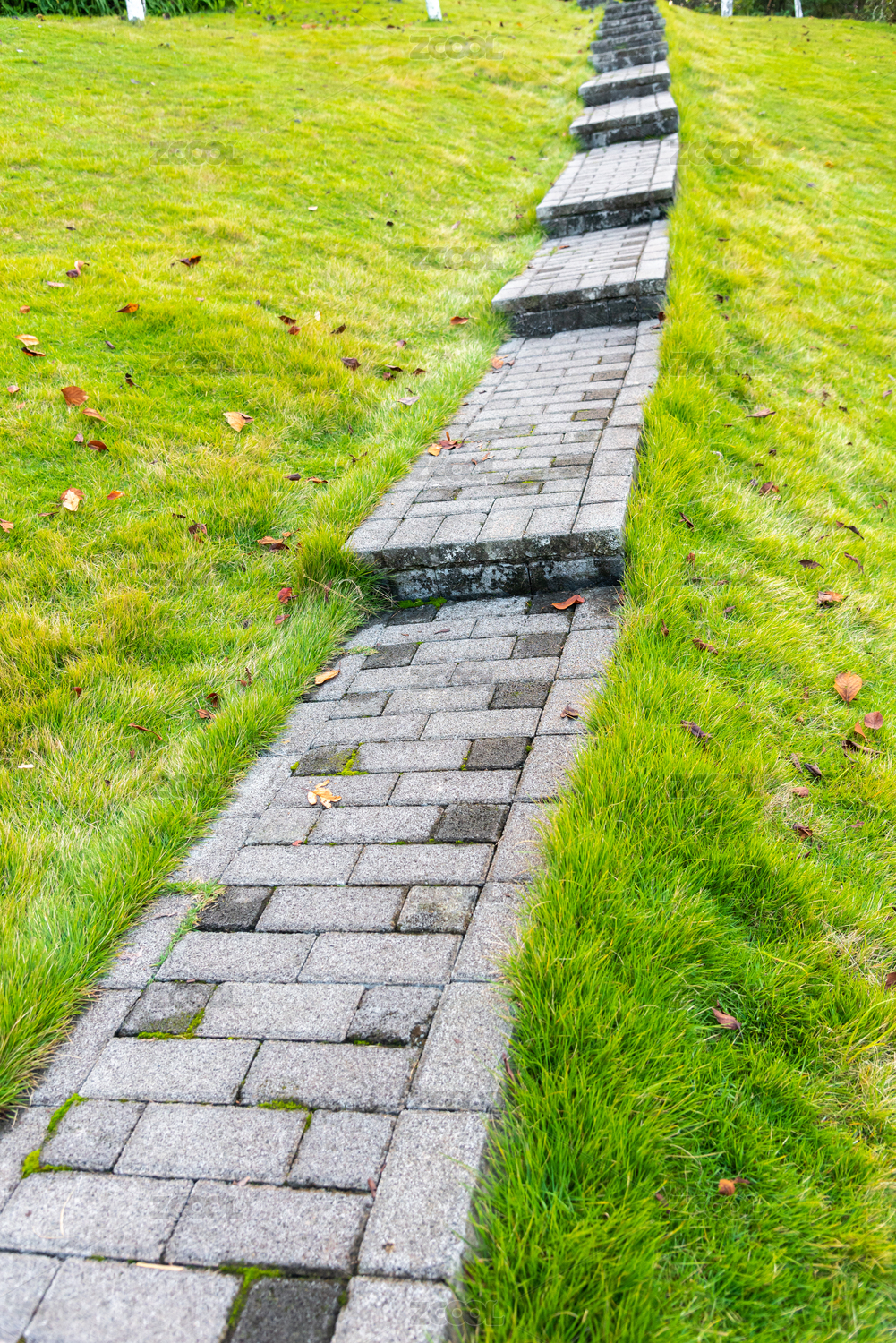 公園綠色草坪里的一條上坡磚塊小路