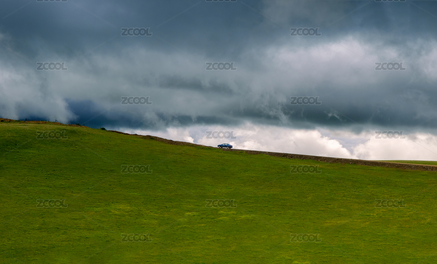 高原上一輛孤獨上坡行駛的汽車將要駛?cè)朐茖?/div>