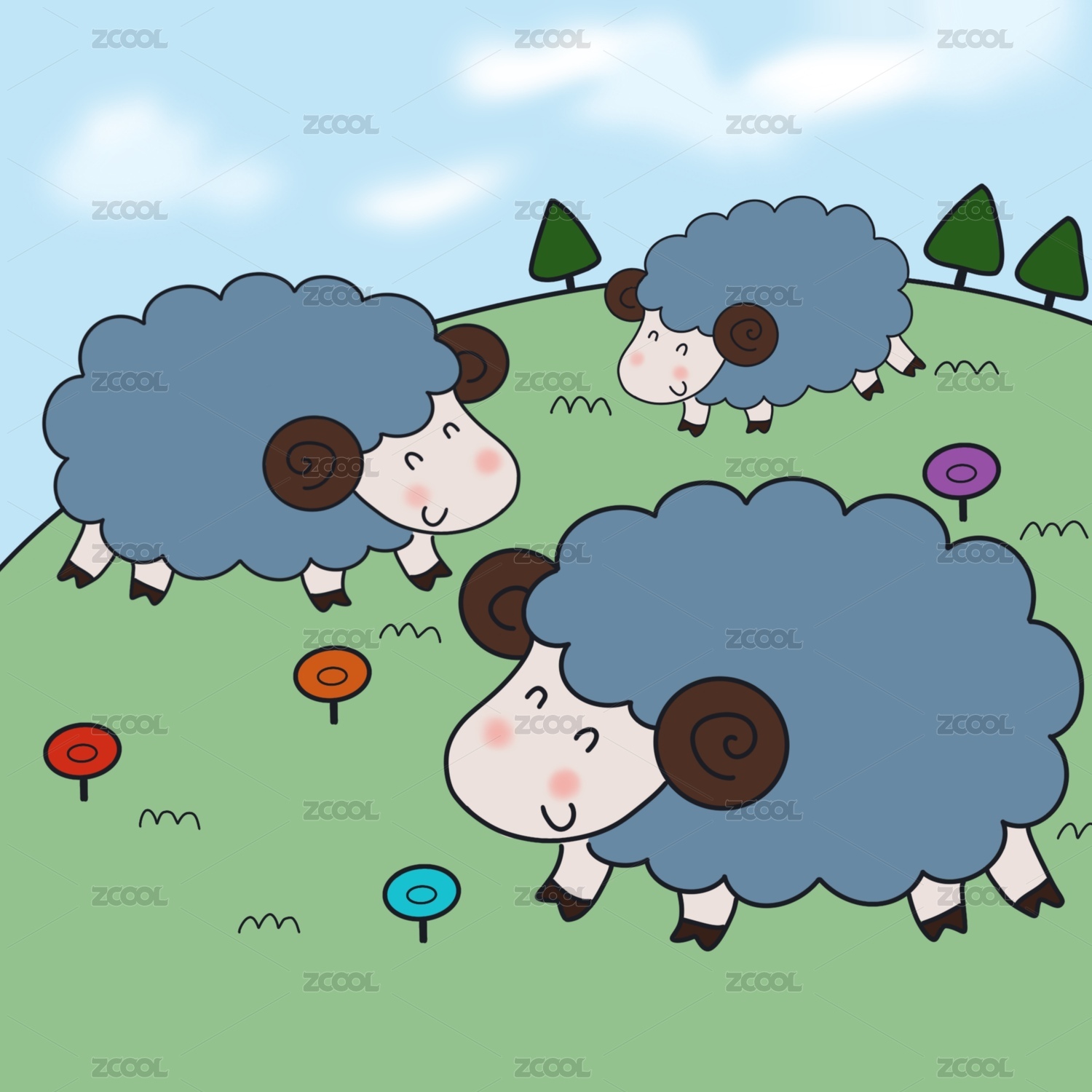 軟綿綿的小羊在上坡上開心的玩耍,水彩畫